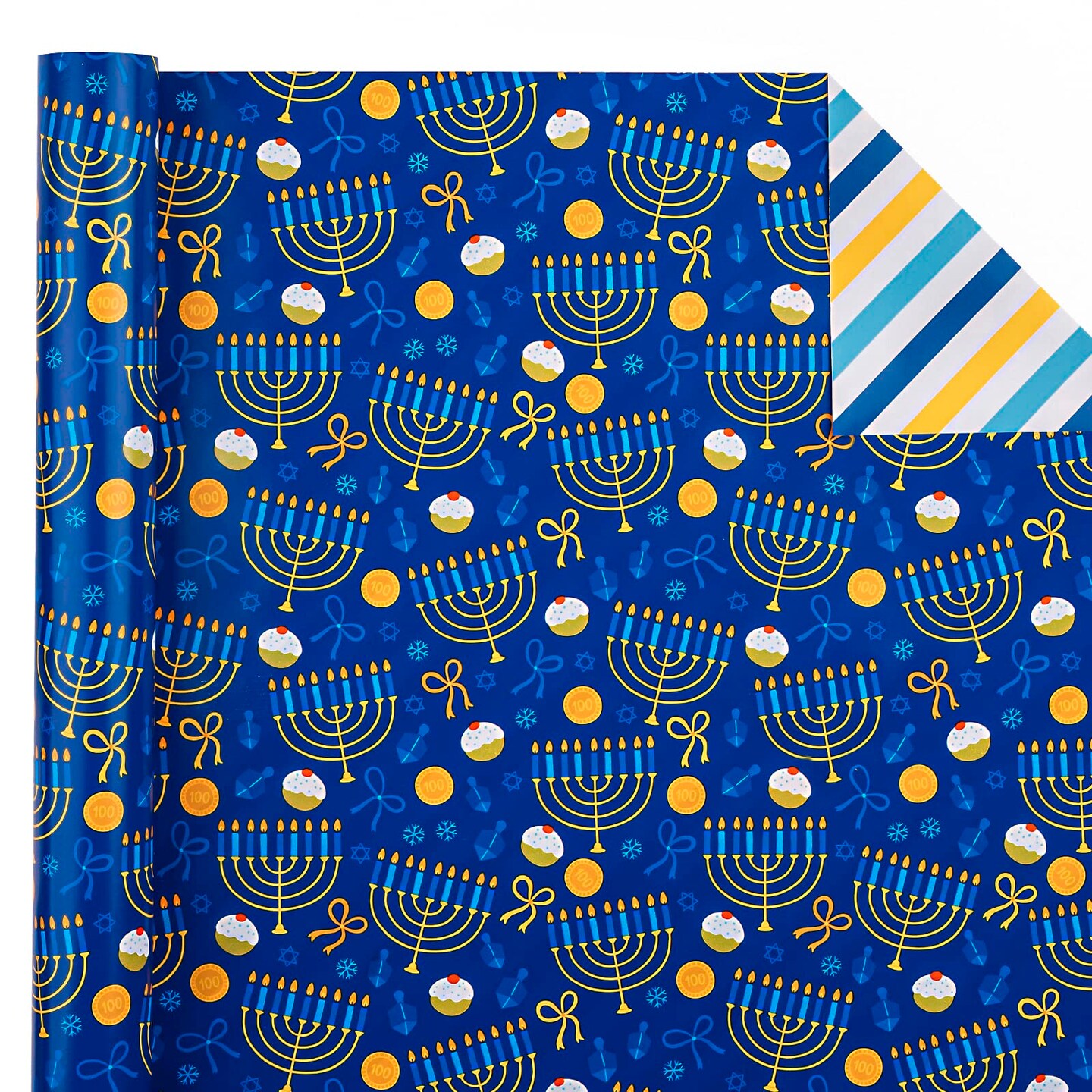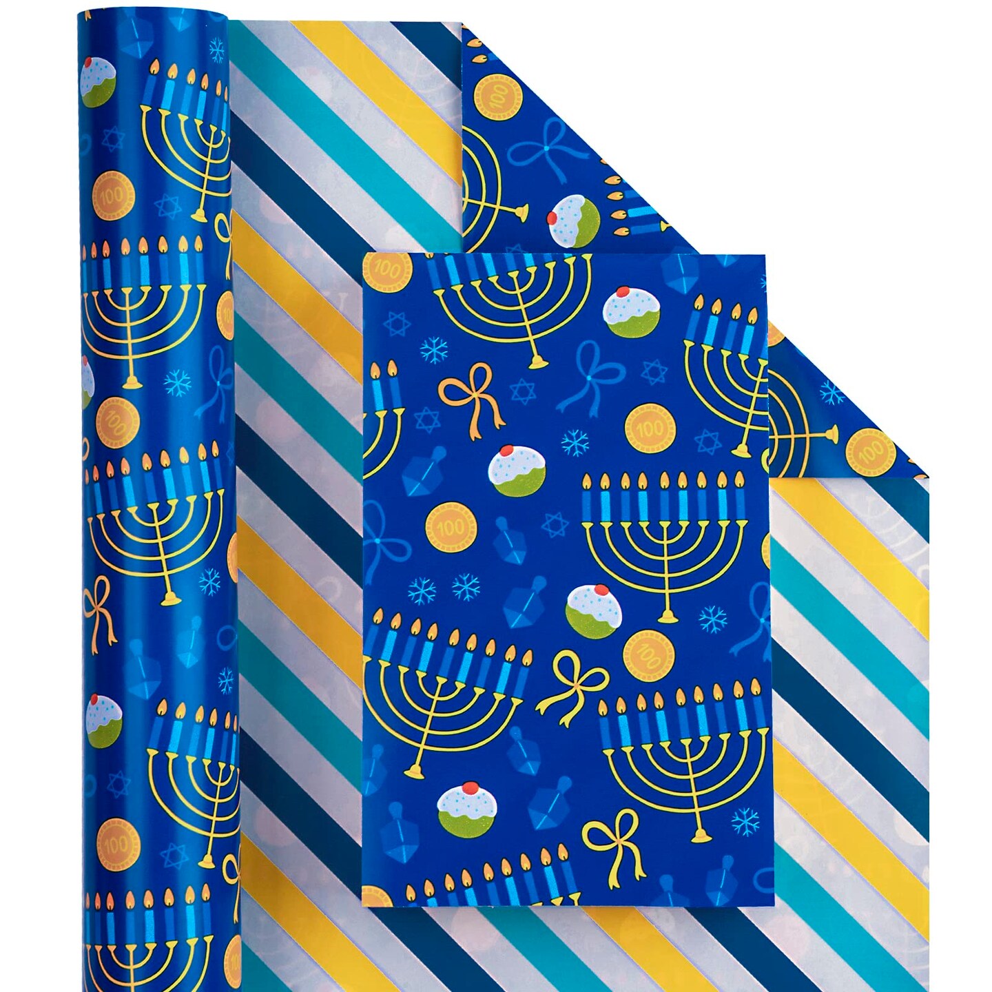 Reversible Hanukkah Wrapping Paper - Mini Roll - 17 Inch x 33 Feet - Blue Gold White Menorahs and Stripe Chanukah Wrapping Paper Perfect for Hanukkah, Chanukah, Holiday