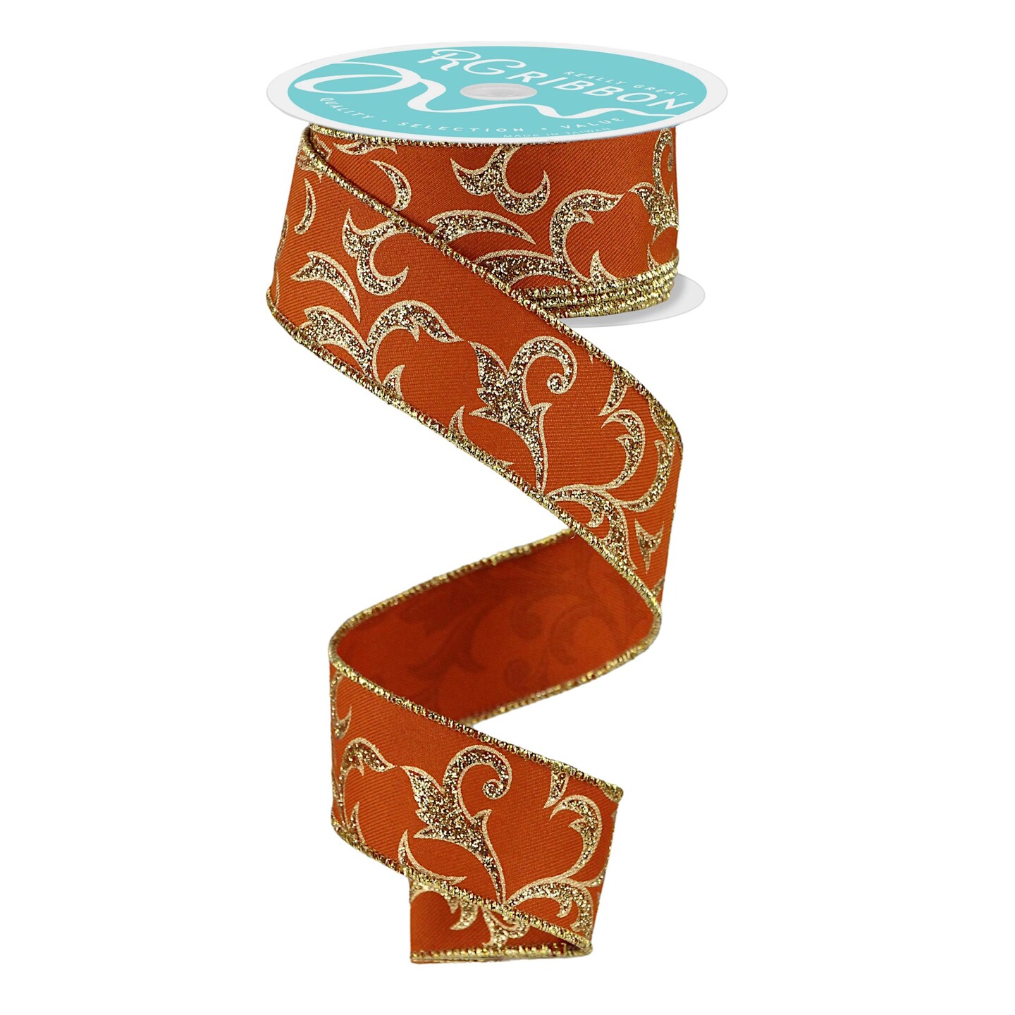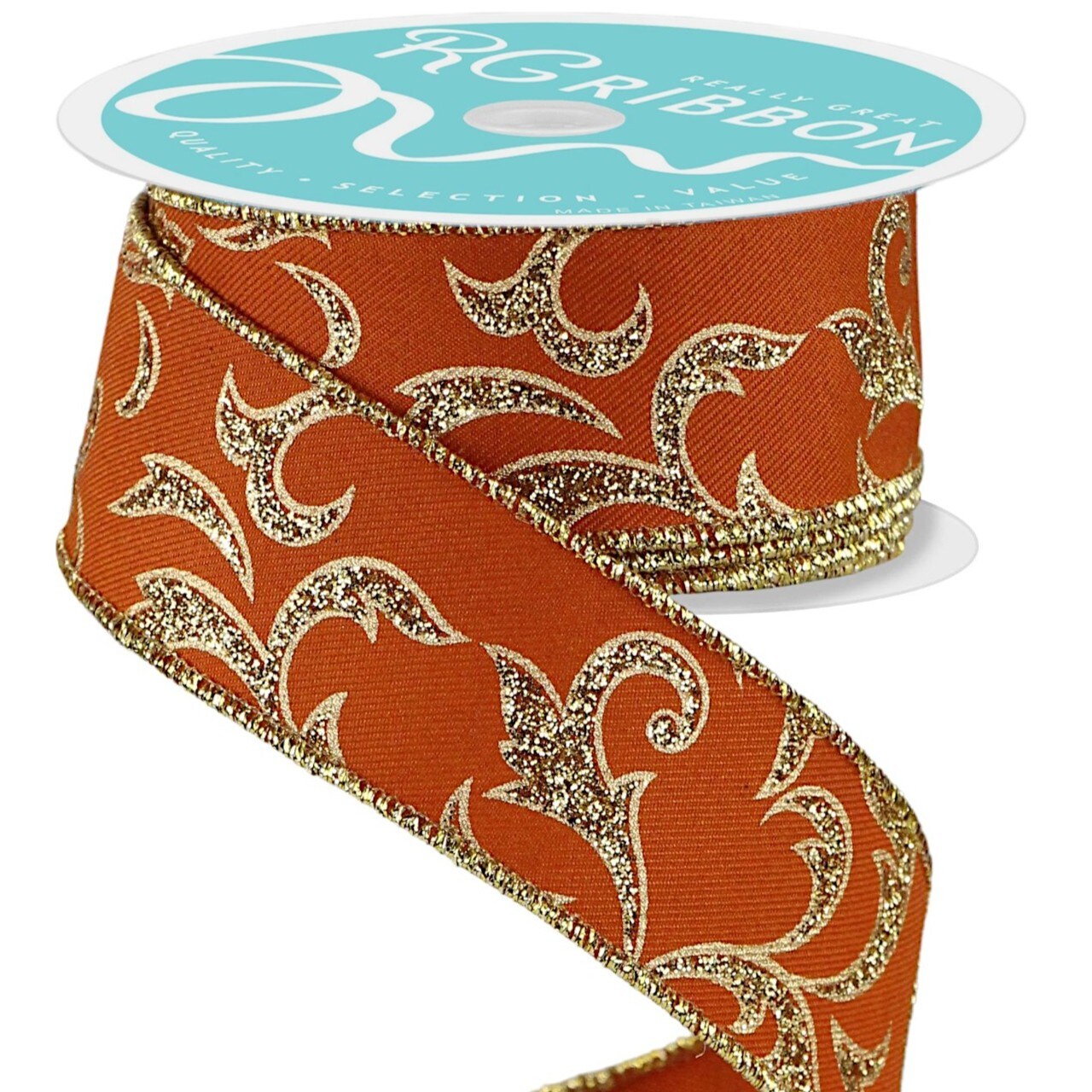 RG Ribbon 1.5" - 2.5" Glitter Filigree Scroll Wired Ribbon Autumn Orange, Gold for Bows, Wreaths, and Decorations