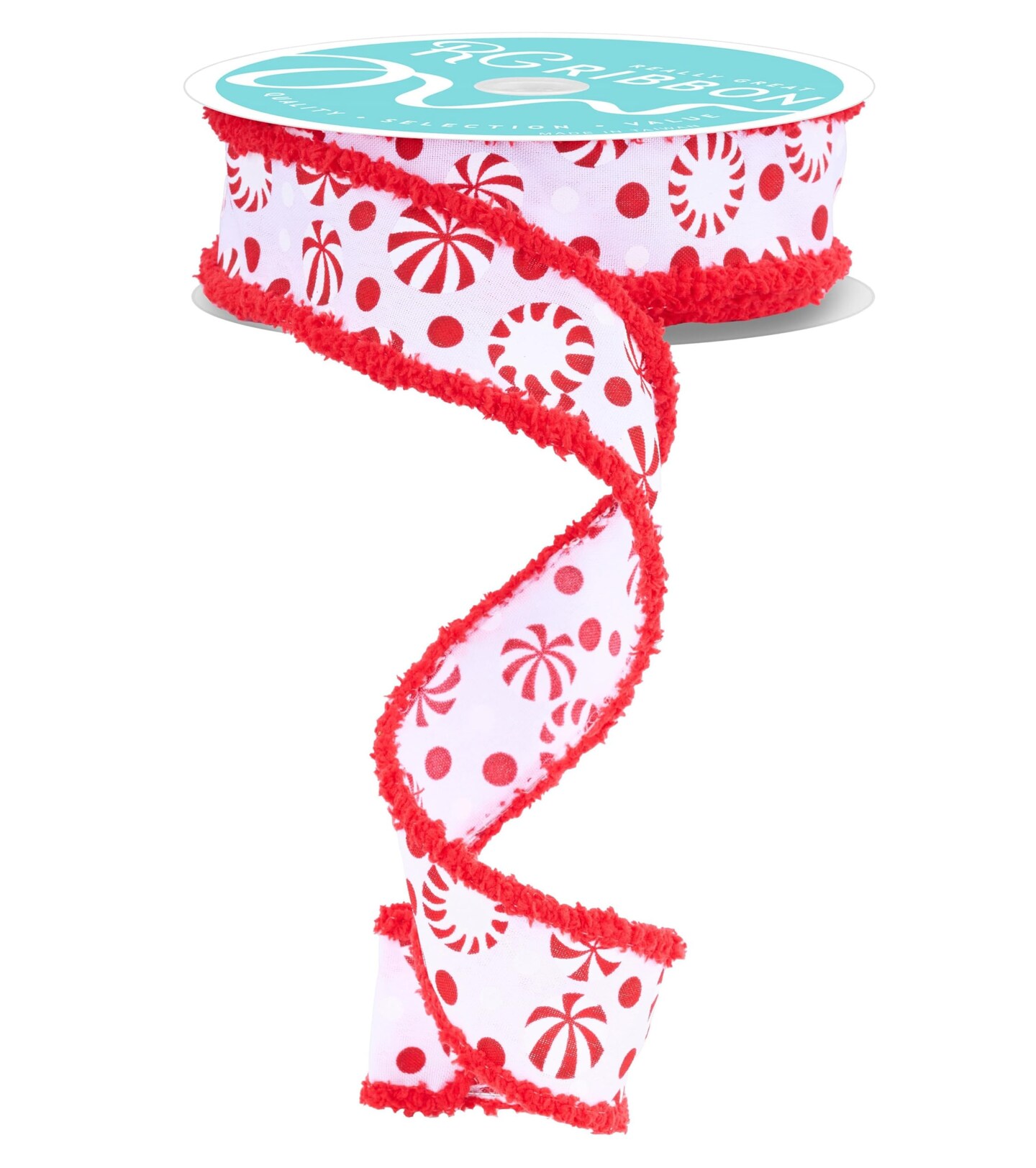 RG Ribbon: 1.5" Christmas Peppermint Candy Wired Ribbon with Drift Edges - 10 Yards - White, Red - For Bows, Wreaths, Crafts, and Decorations