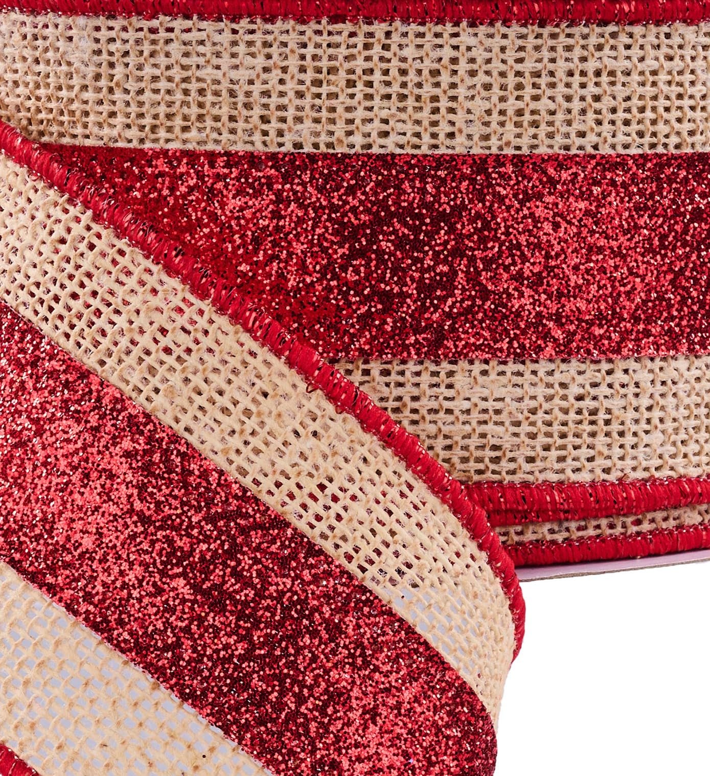 RG Ribbon 2.5" Farmhouse Glam Glitter Stripe with Wired Edges (Red, Natural, 10 Yards) - For Bows, Wreaths, Crafts, and Decorations - Christmas, Valentine's Day, 4th of July