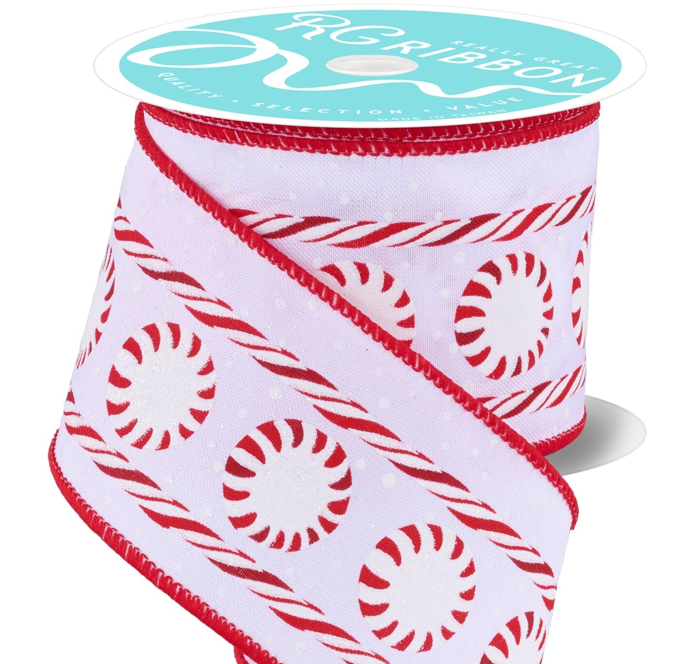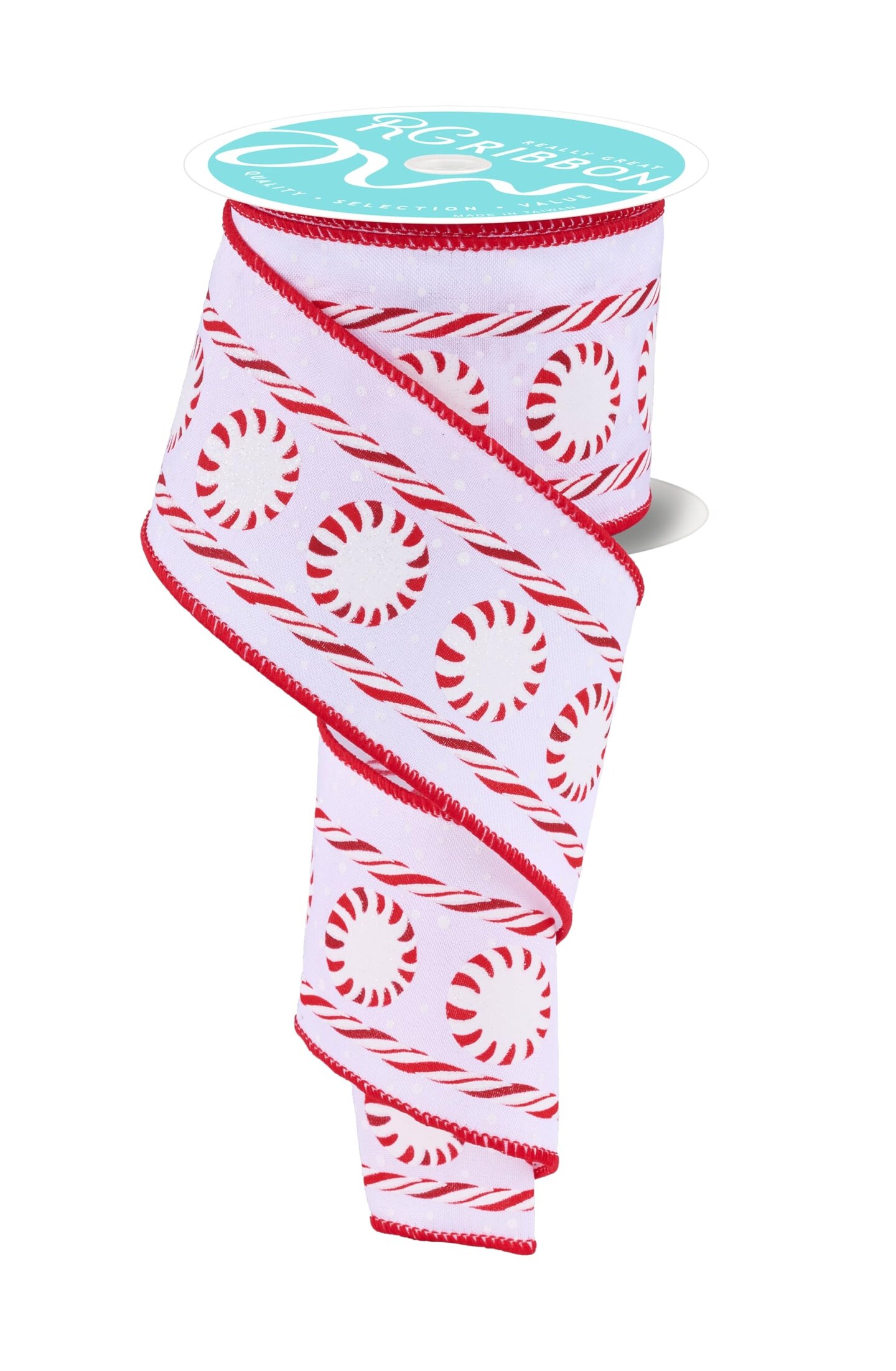 RG Ribbon: 2.5" Peppermints and Candy Ribbon Stripes Wired Ribbon - 10 Yards - White, Red - For Bows, Wreaths, Crafts and Christmas Decorations, Satin