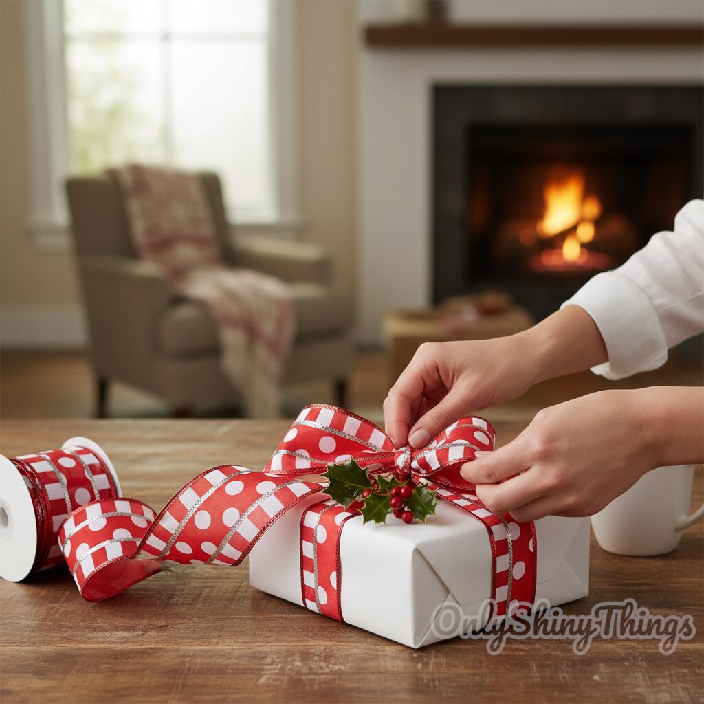 RG Ribbon: 2.5" Polka Dots with Stripes Wired Ribbon, 10 Yards - Red, White, Silver - for Bows, Wreaths, Crafts, and Christmas Decorations
