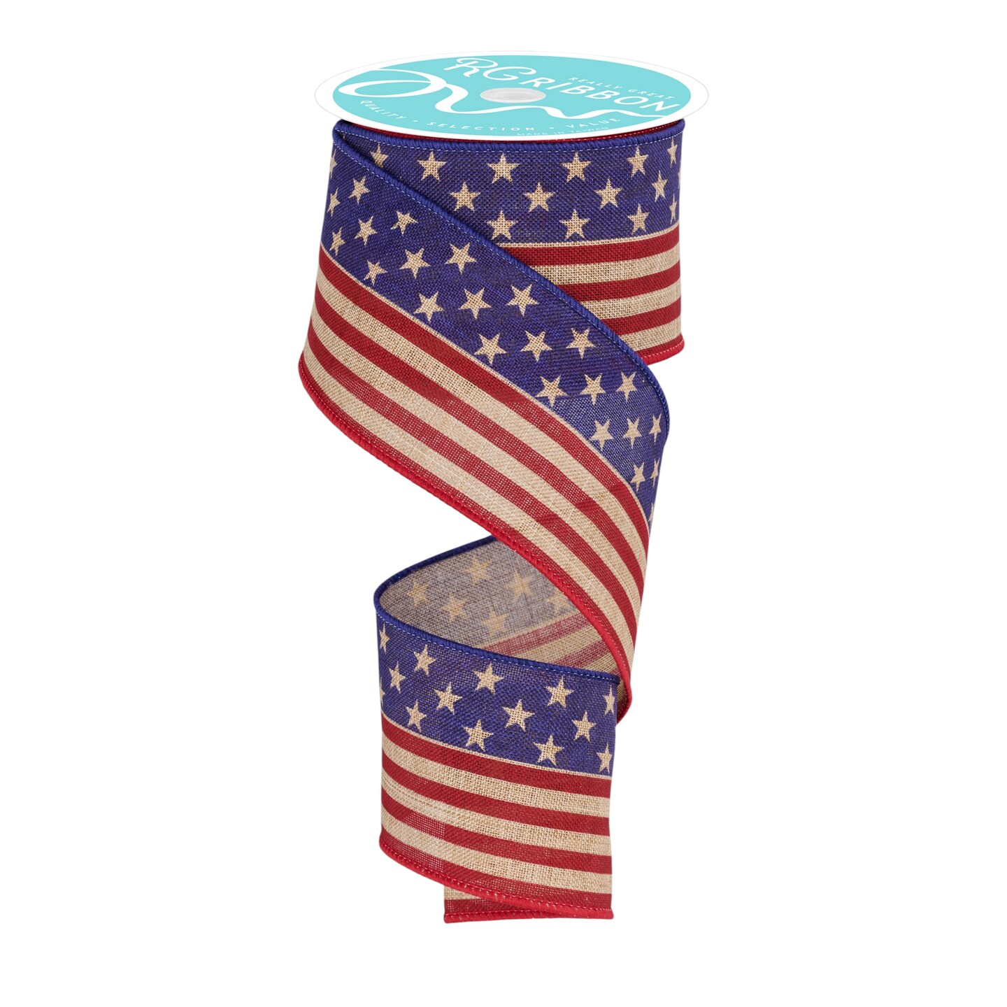 RG Ribbon: 2.5" Stars and Stripes Wired Burlap Ribbon, Light Beige, Burgundy Red, Navy Blue - For Bows, Wreaths, Crafts, and Decorations