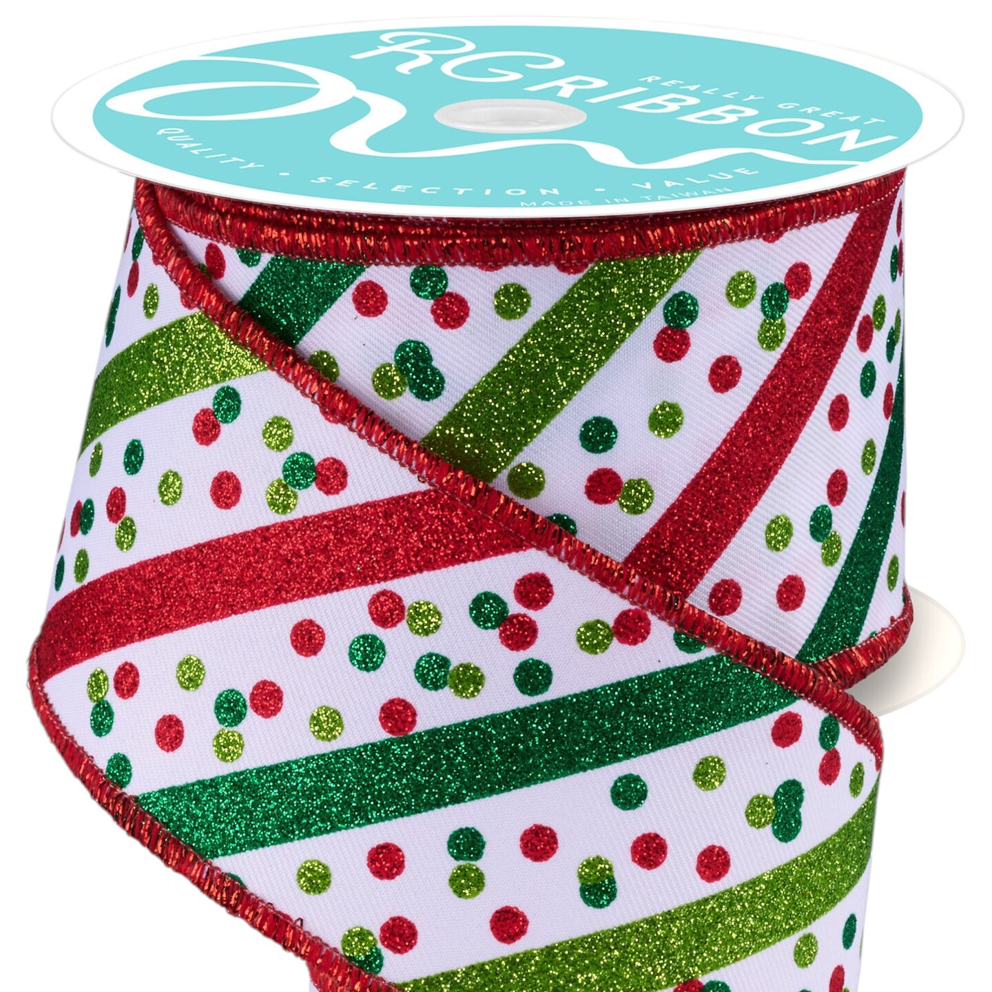 RG Ribbon: Stripes & Confetti Dots Wired Edge Ribbon - White, Lime Green, Red, Emerald - For Bows, Wreaths, Crafts, and Decorations