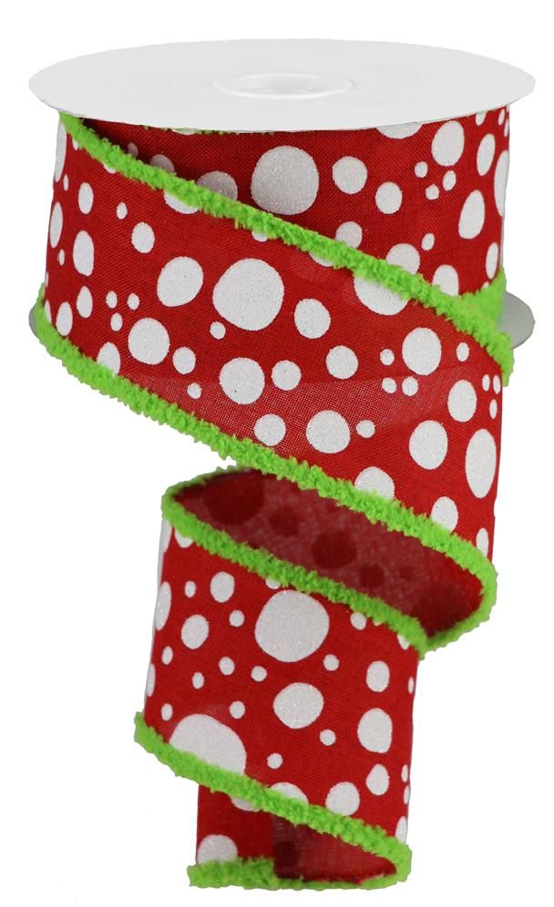RG Ribbon: White Iridescent Polka Dot Christmas Ribbon, 2.5" x 10 Yards, Wired, Drift Edges – Red, White, Lime Green