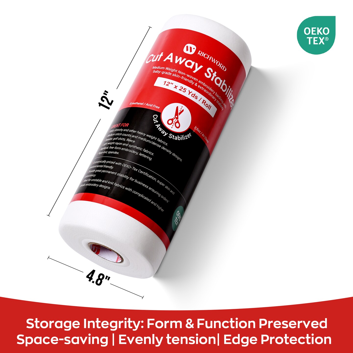 Richword Selected Cut Away Embroidery Stabilizer for Knits, 2.5 oz Medium Weight Permanent Anti-Pucker Backing, 9 x 9 in Sheets (4x4 & 6x6 Hoops), 12 x 12 in Sheets (5x7 & Larger Hoops), 12 in x 25 yd & 50 yd Rolls for Hoodies, Fleece & Babywear