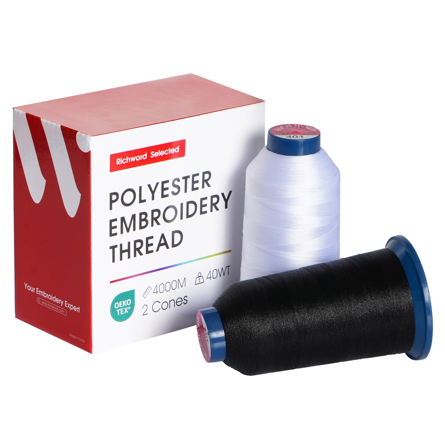 Richword Selected Embroidery Thread, 2 Rolls per Pack, 4000M (4374Y) 40WT Polyester Thread, White, Black, Red & Combo, Huge Spool for All Embroidery Machines