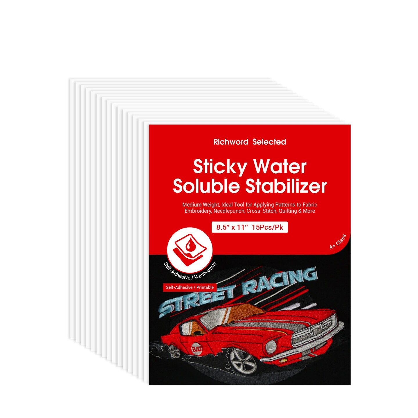 Richword Selected Printable Sticky Water-Soluble Embroidery Stabilizer, Wash Away Self-Adhesive Topper for Hand & Home Machine Embroidery, 8.5 x 11 in Sheets (10, 15 & 30 Pack) and 12 in x 10 yd Roll