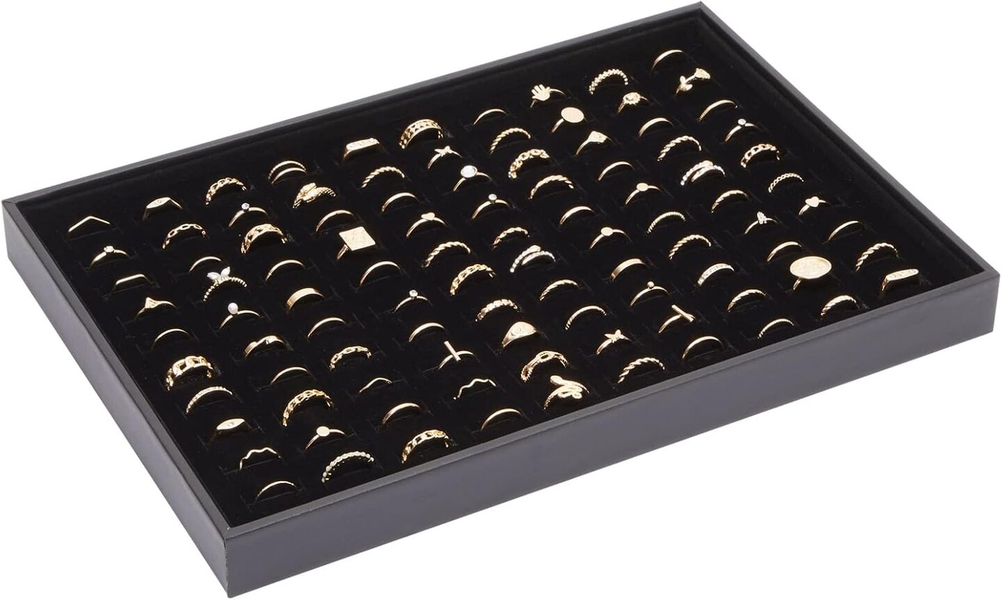 Ring Display Tray – Velvet Jewelry Organizer with Removable Pad & Earring Storage, Stackable Ring Trays & Glasses Holder for Nightstand – Pack of 2, Black, 13.8 x 9.5 x 1.3 in