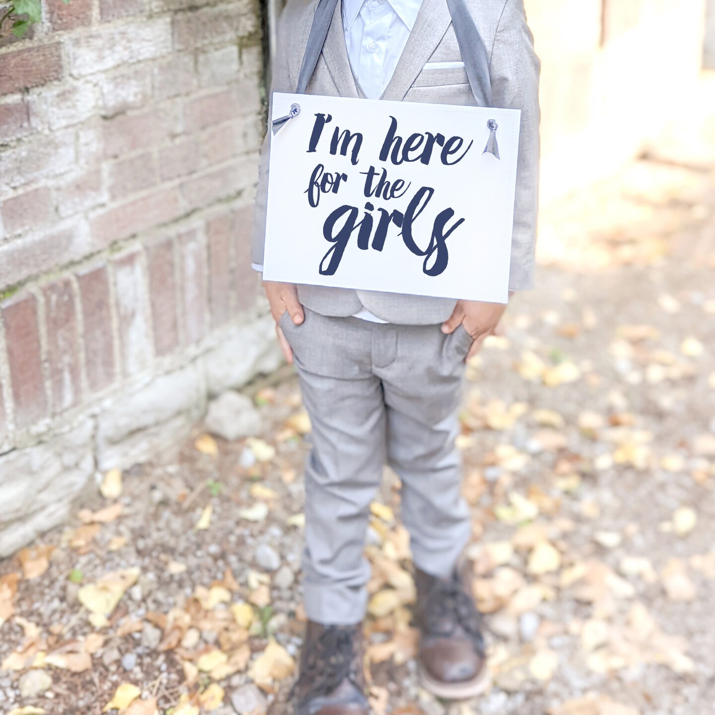 Ritzy Rose Cute Ring Bearer Sign - Black on 11x8in Ivory Linen Cardstock with Dusty Blue Ribbon