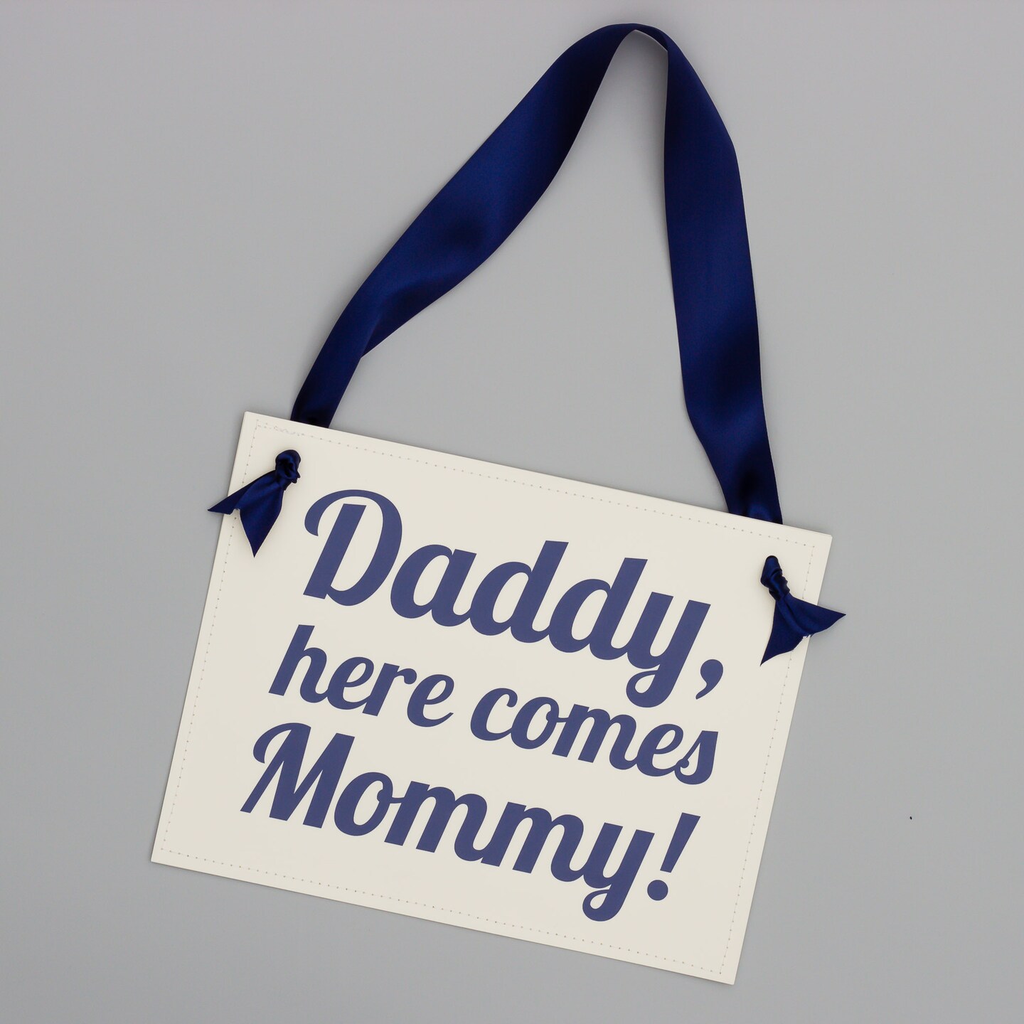 Ritzy Rose Cute Ring Bearer Sign - Navy Blue on 11x8in Ivory Linen Cardstock with Navy Blue Ribbon