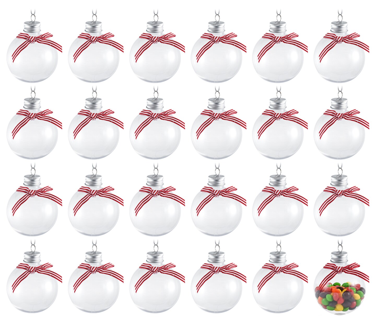 RN'D Toys Clear Fillable Ornaments - Shatterproof Transparent Plastic Craft Ornament Balls Decorations with Red and White Ribbon for DIY Christmas Ball Sphere Ornament Set - Pack of 24