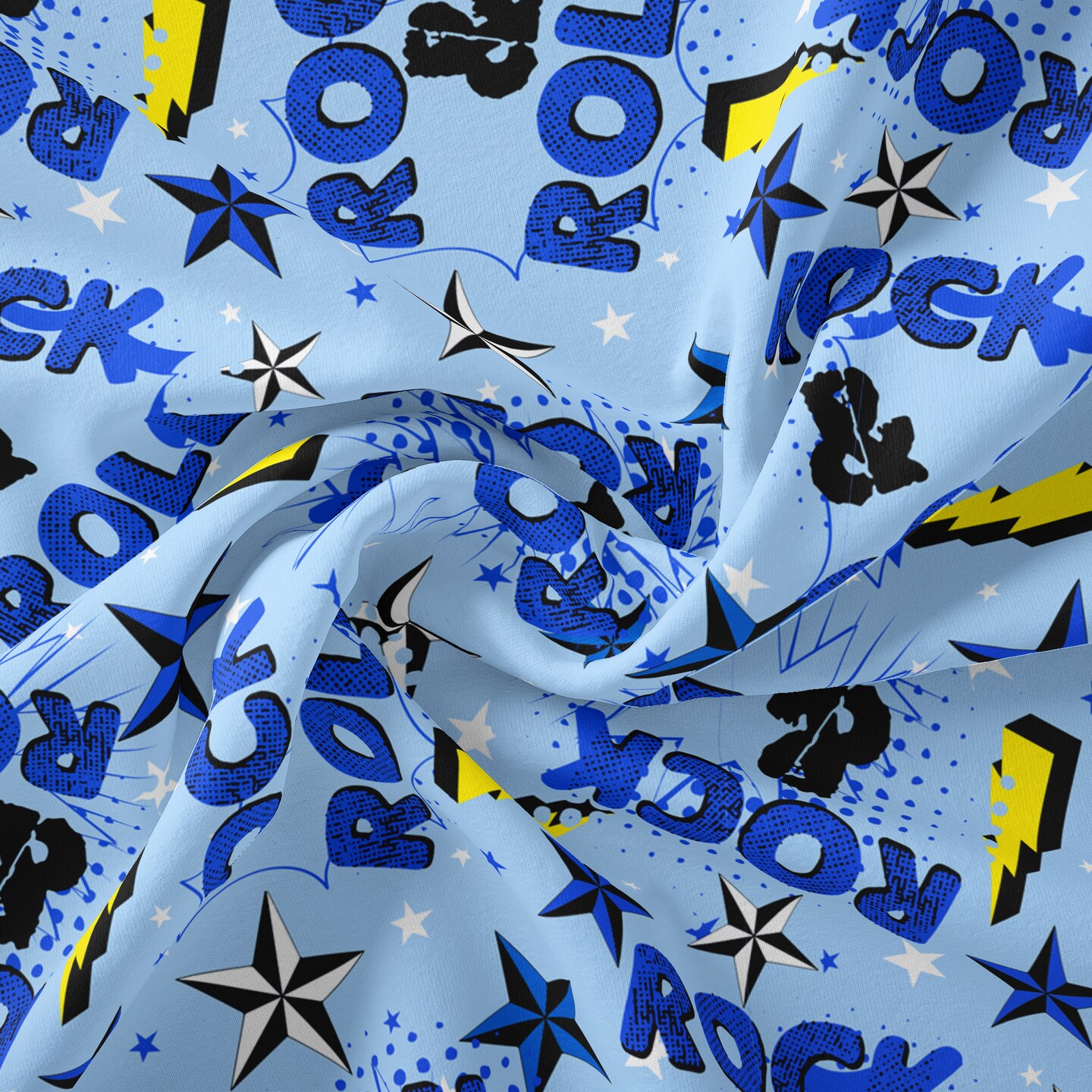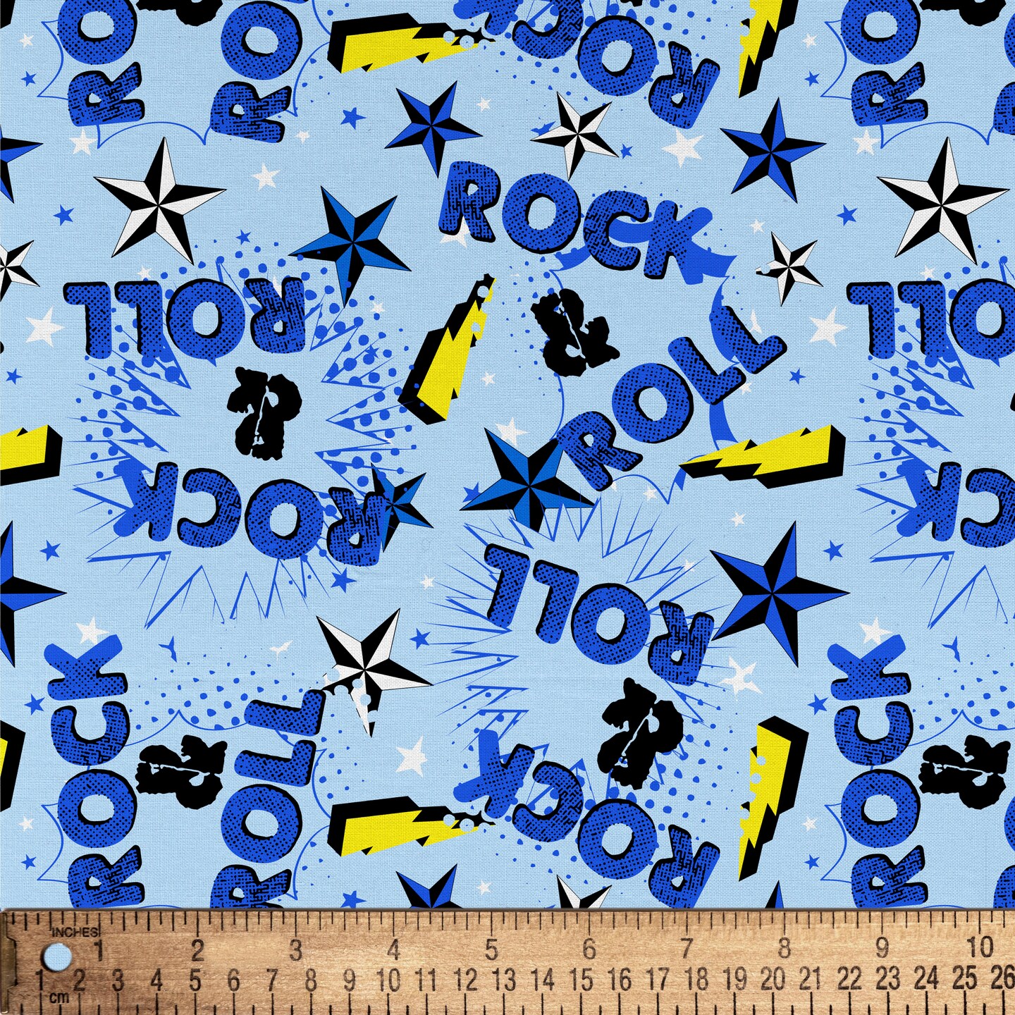 ROCK N ROLL LT BLUE YELLOW 1 YD CUT COTTON
