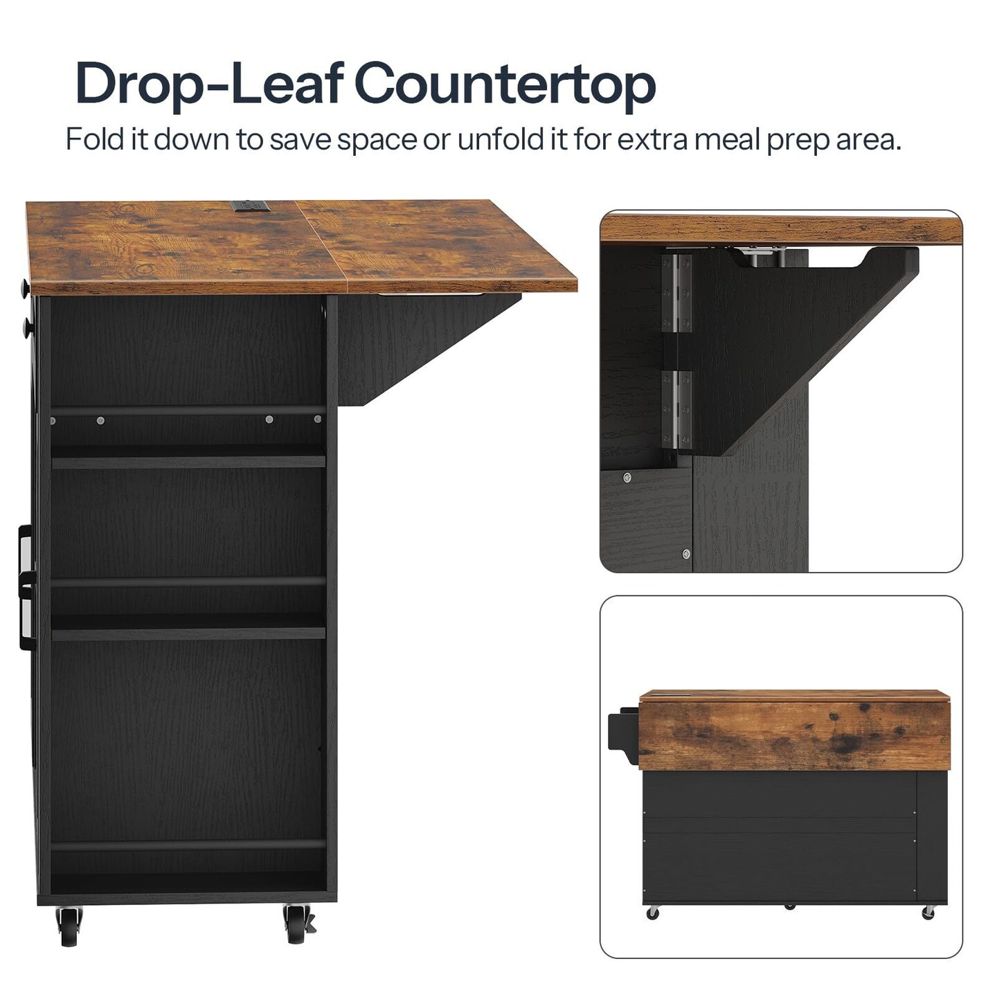 Rolling Kitchen Island with Drop Leaf Table, USB Outlet, Storage