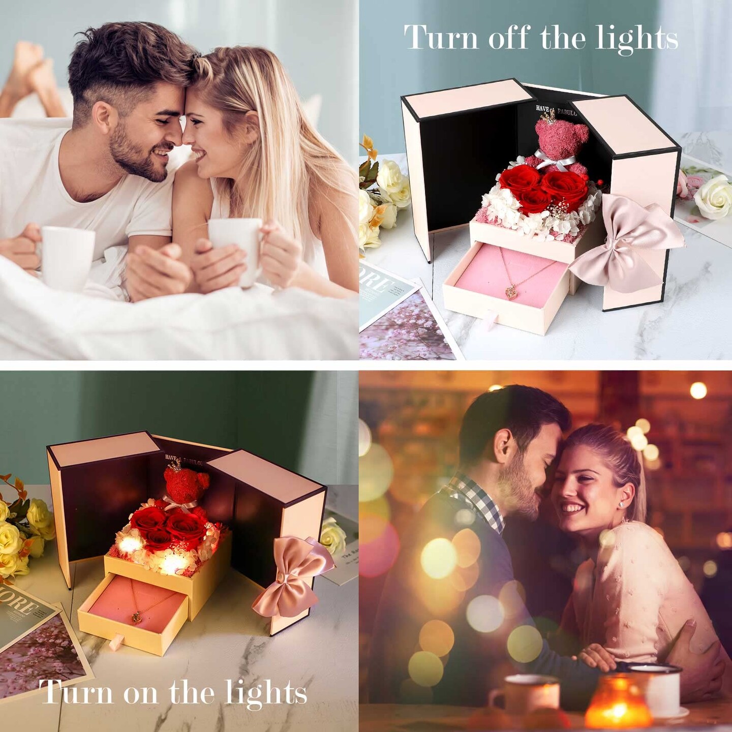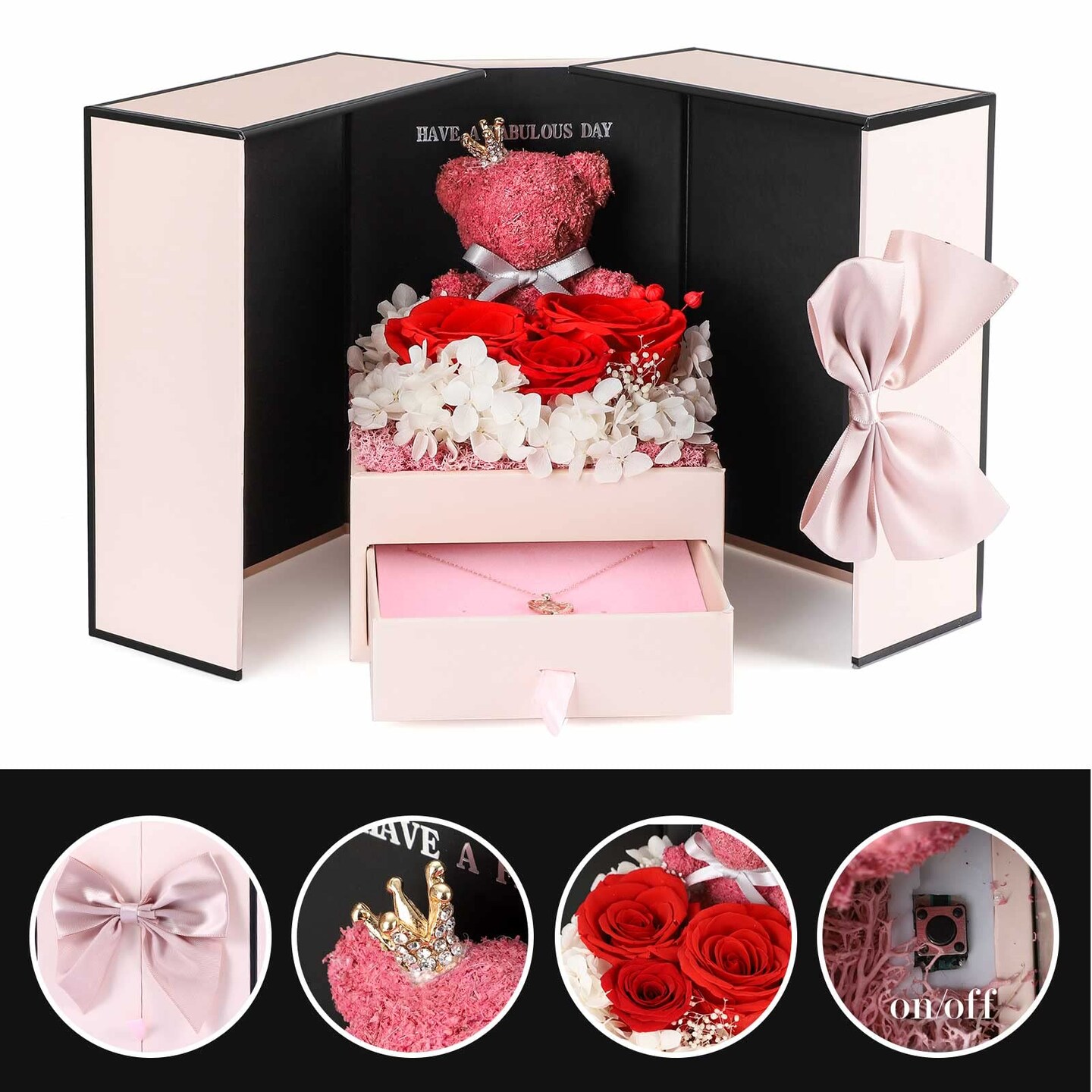 Rose Gifts for Women Birthday Christmas - Preserved Real Roses Forever Red Flowers with I Love You in 100 Languages Necklace and Cute Moss Bear for Girlfriend Wife Mom Grandma