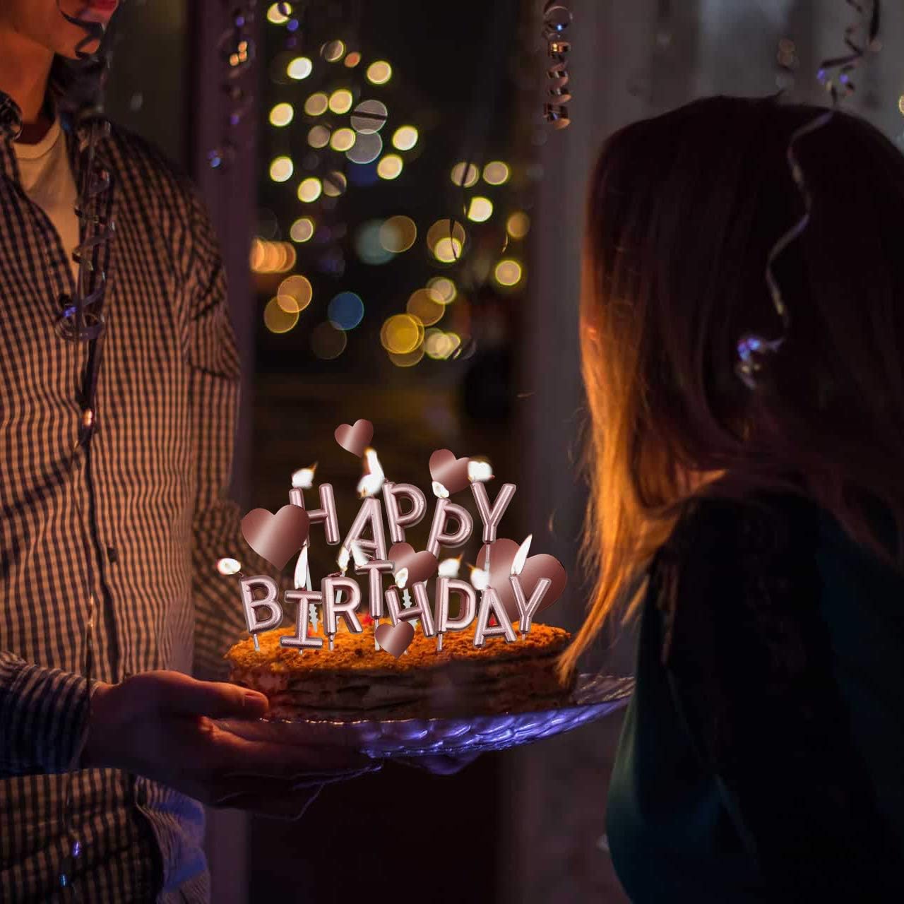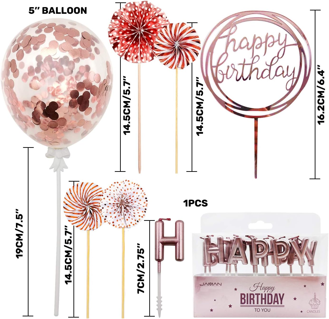 Rose Gold Cake Topper Decoration with Happy Birthday Candles Happy Birthday Banner Confetti Balloon Paper Fans For Rose Gold Theme Party Decor Girl Women Birthday Party