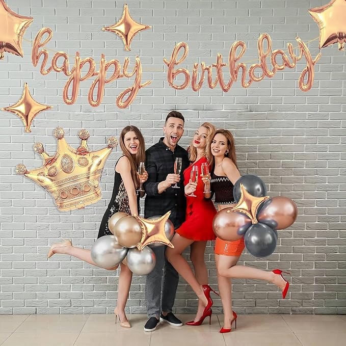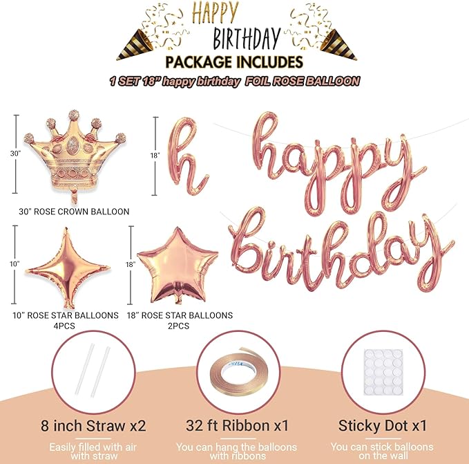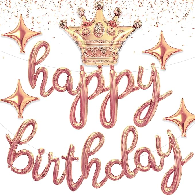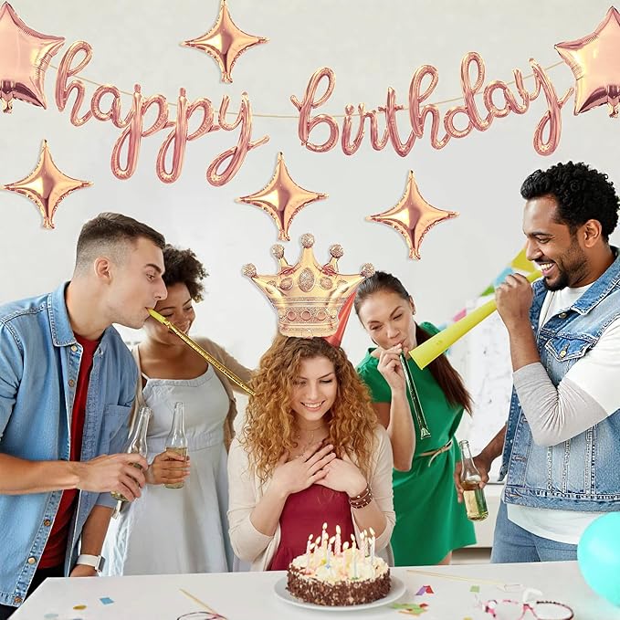 Rose Gold Happy Birthday Balloons Banner 18 Inch Script/Cursive Foil Mylar Letter Balloon Sign with Crown, Star Balloons Birthday Party Decoration Party Supplies for Women Men Boys Girls