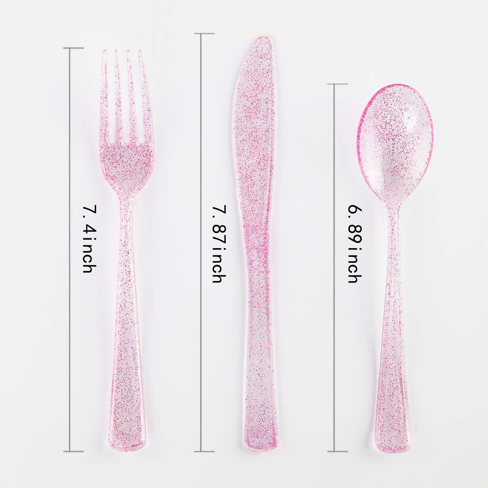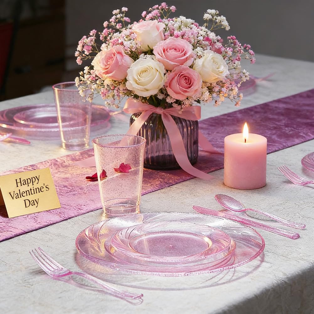 Rose Gold Pink Plastic Plates with Pink Plastic Silverware include 40 Dinner & Salad Plates, 40Forks, 40 Knives, 40 Spoons for Wedding/Party/Valentine's Day