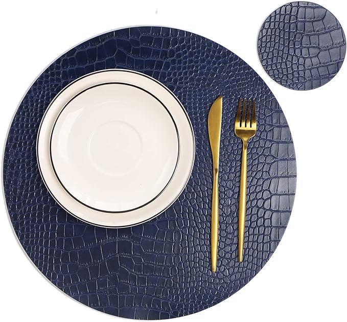Round Leather Placemats for Round Tables Set of 4, Blue Table Place Mats and Coasters