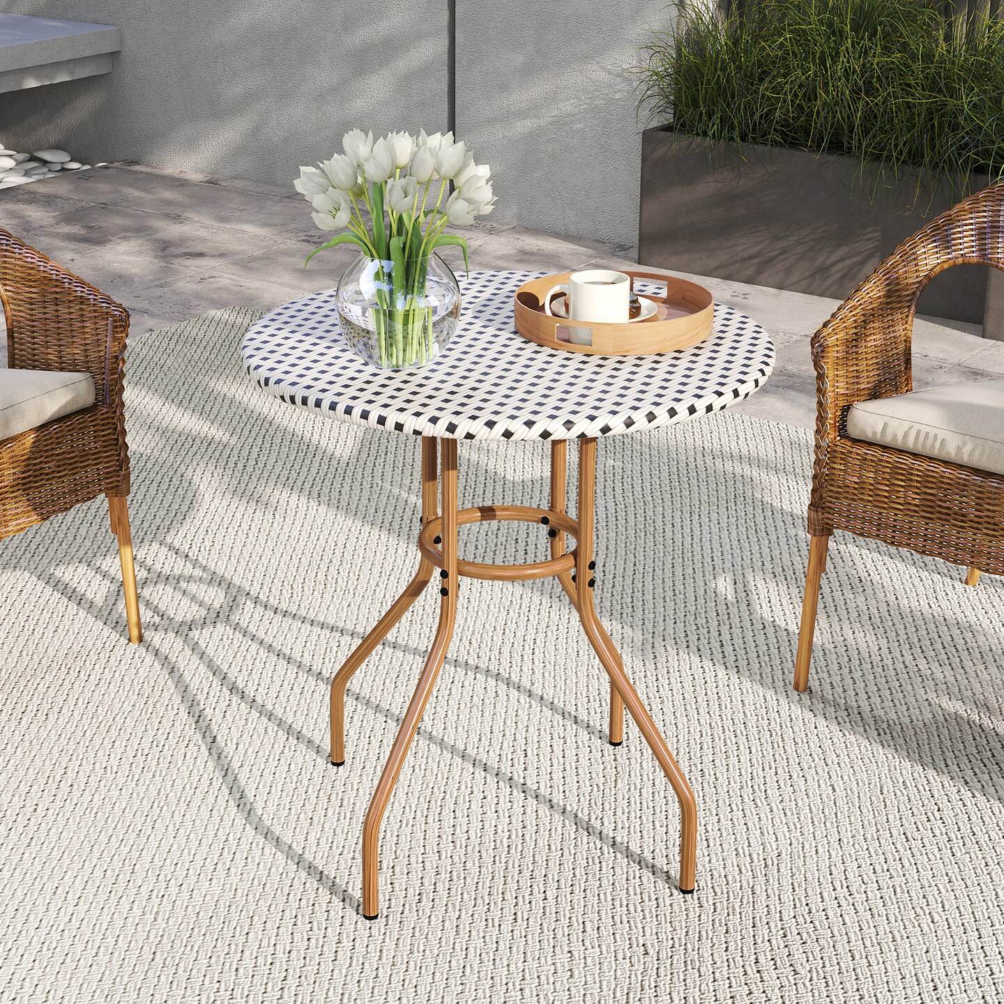 Round Patio Bistro Table for Two, Hand-Woven PE Rattan with Sturdy Metal Frame for Outdoor Use