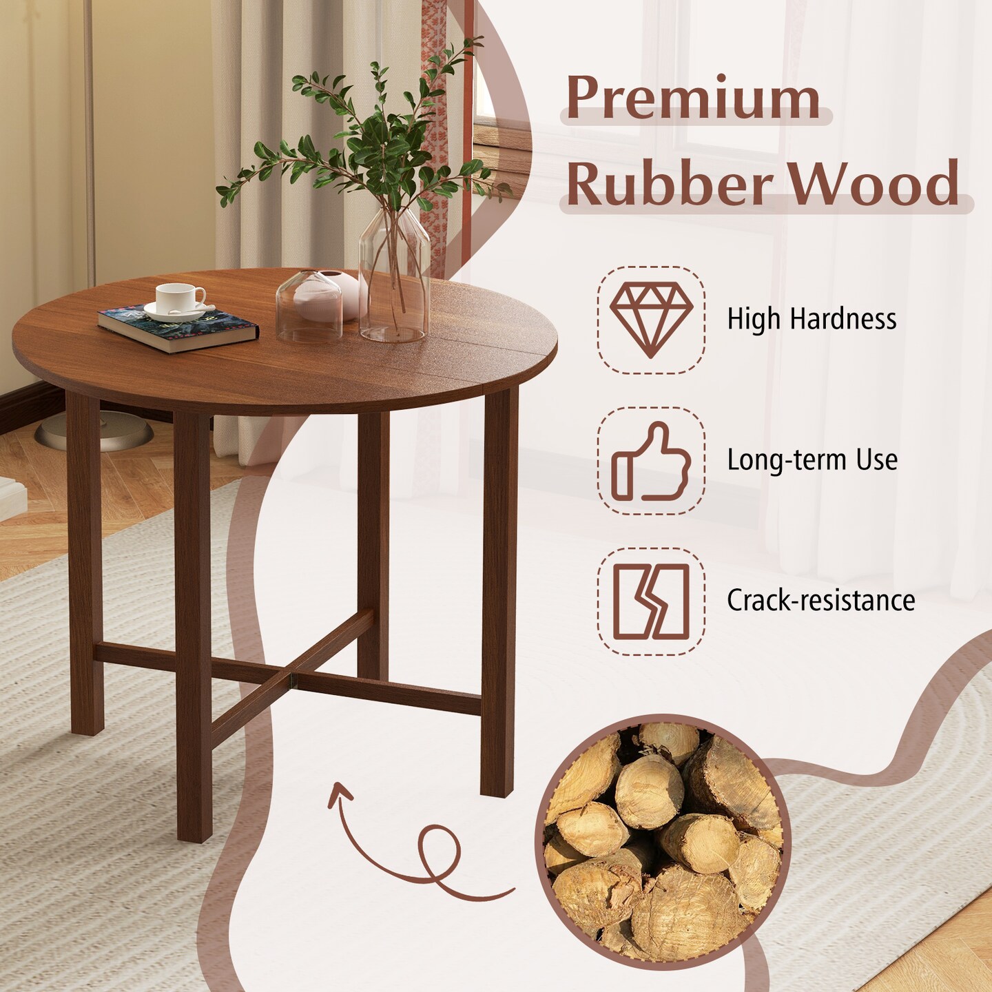 Rubber Wood Extendable Round Dining Table with Double Drop Leaf and Foldable Legs
