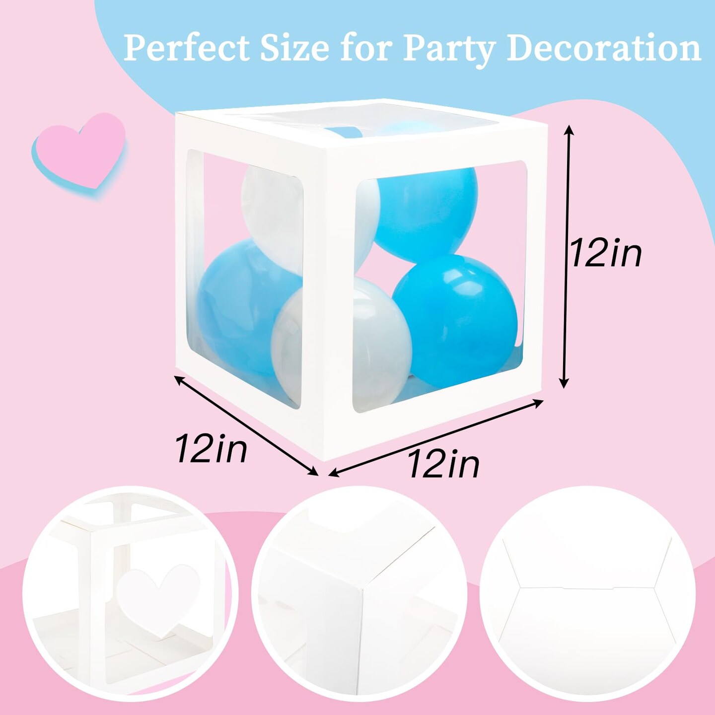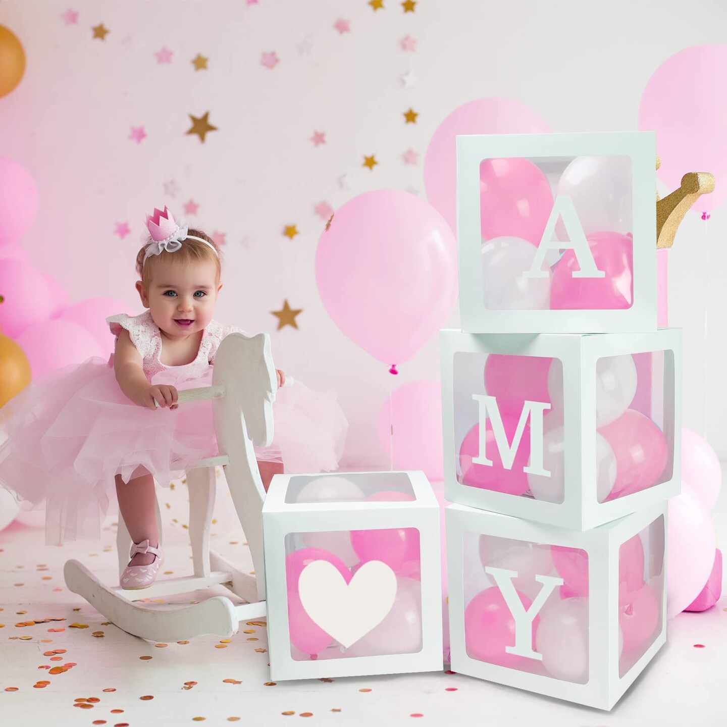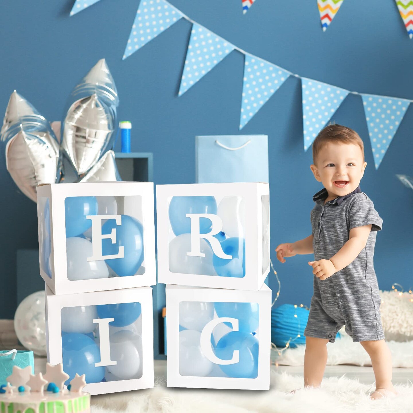 RUBFAC Baby Boxes with 41 Letters and 36 Balloons, 4pcs Clear Balloon Boxes for Baby Shower Gender Reveal Girl Boy Blocks Birthday Party Decorations