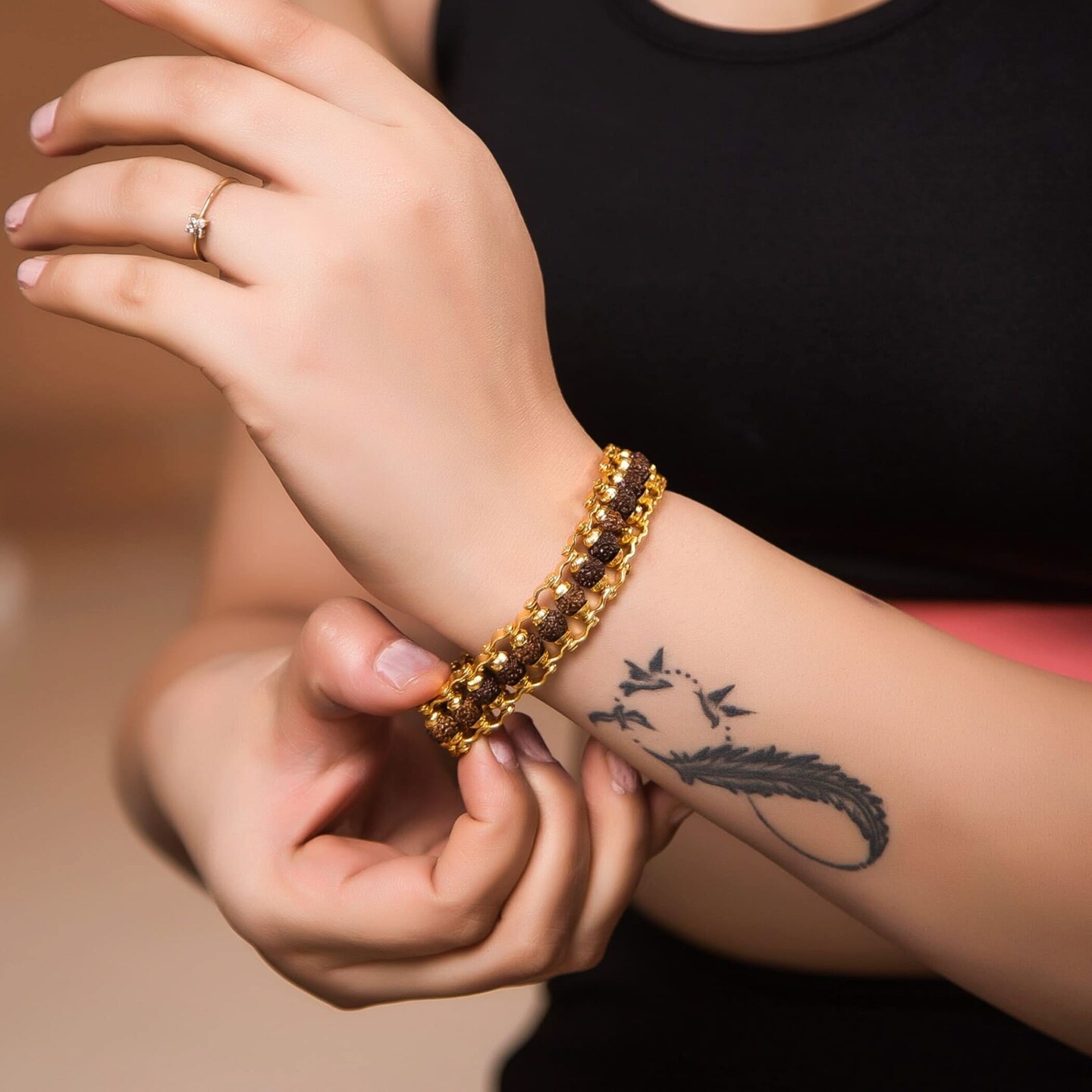 Rudraksha Bracelet for Men Gold Plated Designer Himalayan Bead Bracelet 5-mukhi Face Rudraksha Bead with Golden Color Stainless Steel Spiritual Jewelry for Positive Energy, Prosperity