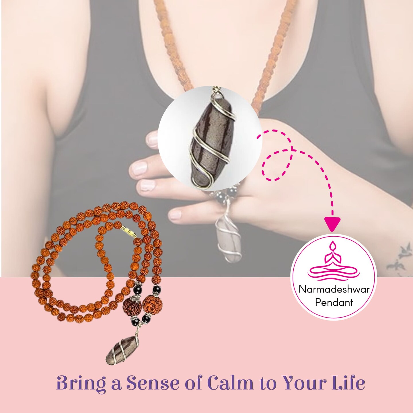 Rudraksha Mala with Narmadeshwar Shivling Pendant for Men Women 5 Mukhi Rudraksha Mala Shaligram Narmada Pendant Necklace Yoga Meditation (pack of 1)
