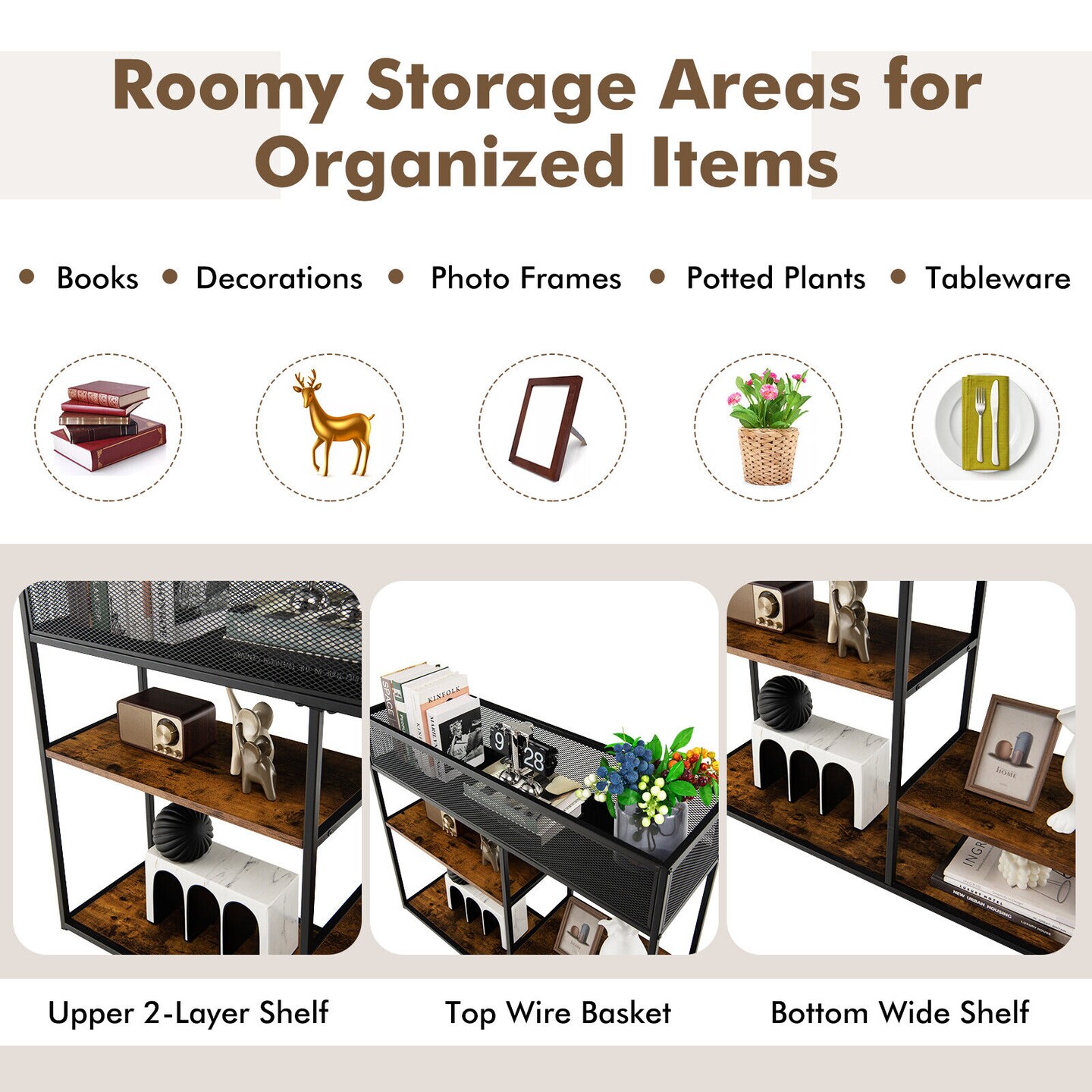 Rustic Brown - Black 4 Tier Entryway Console Table with Wire Basket Storage Shelf