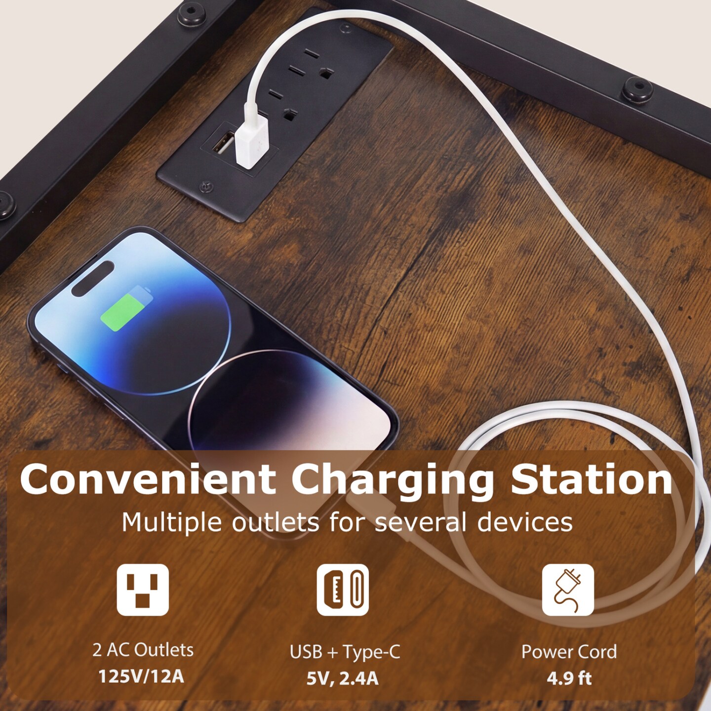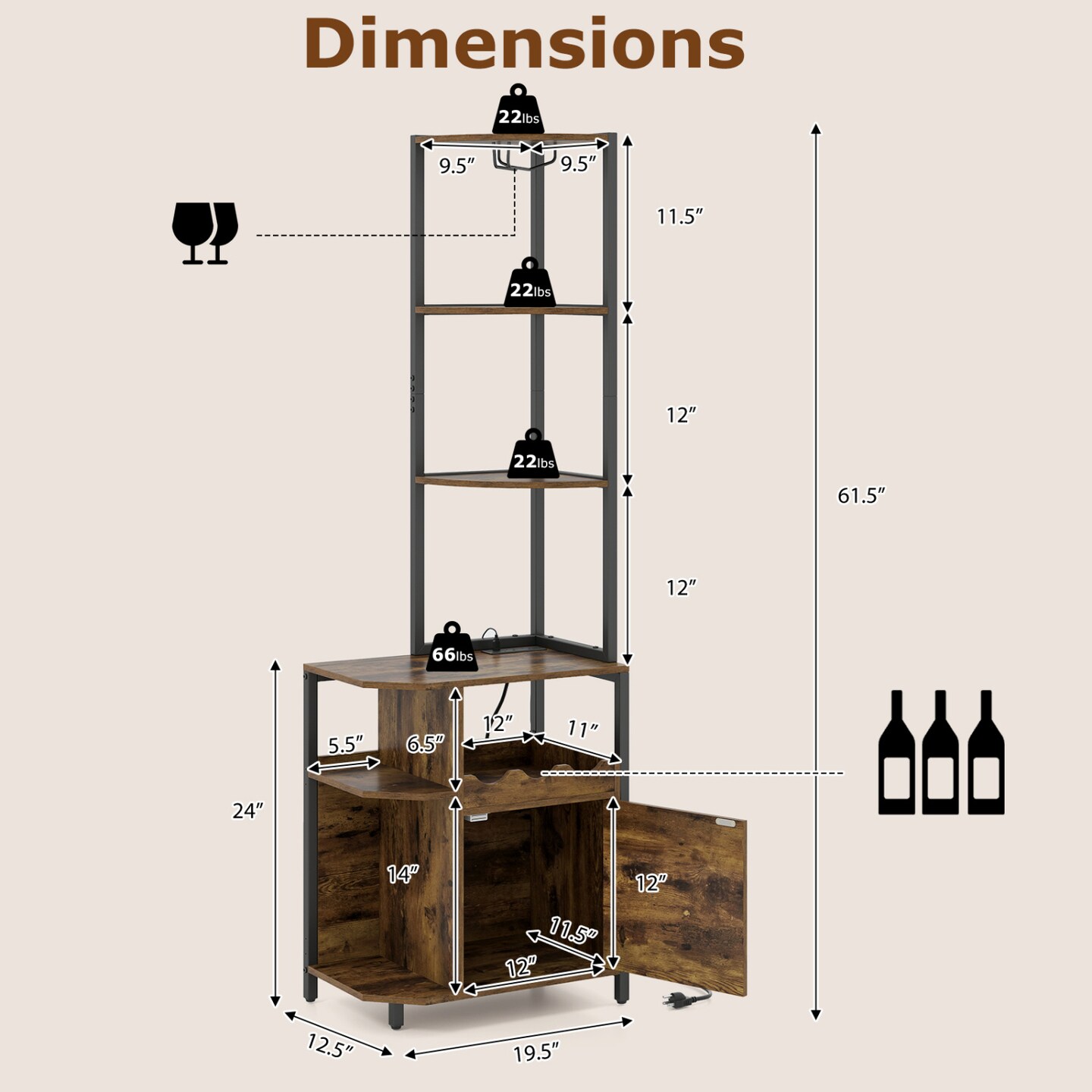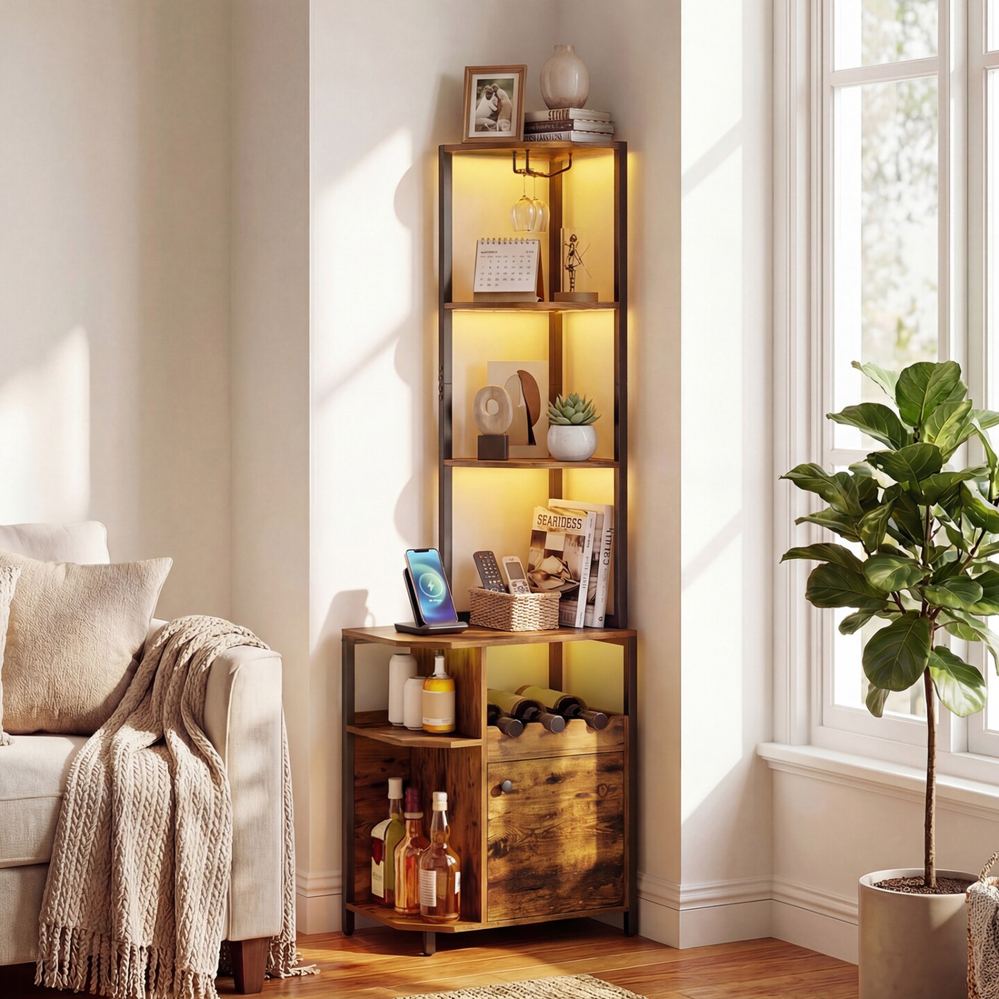 Rustic Brown Corner Bar Cabinet Wine Rack Storage Shelves with LED & Charging