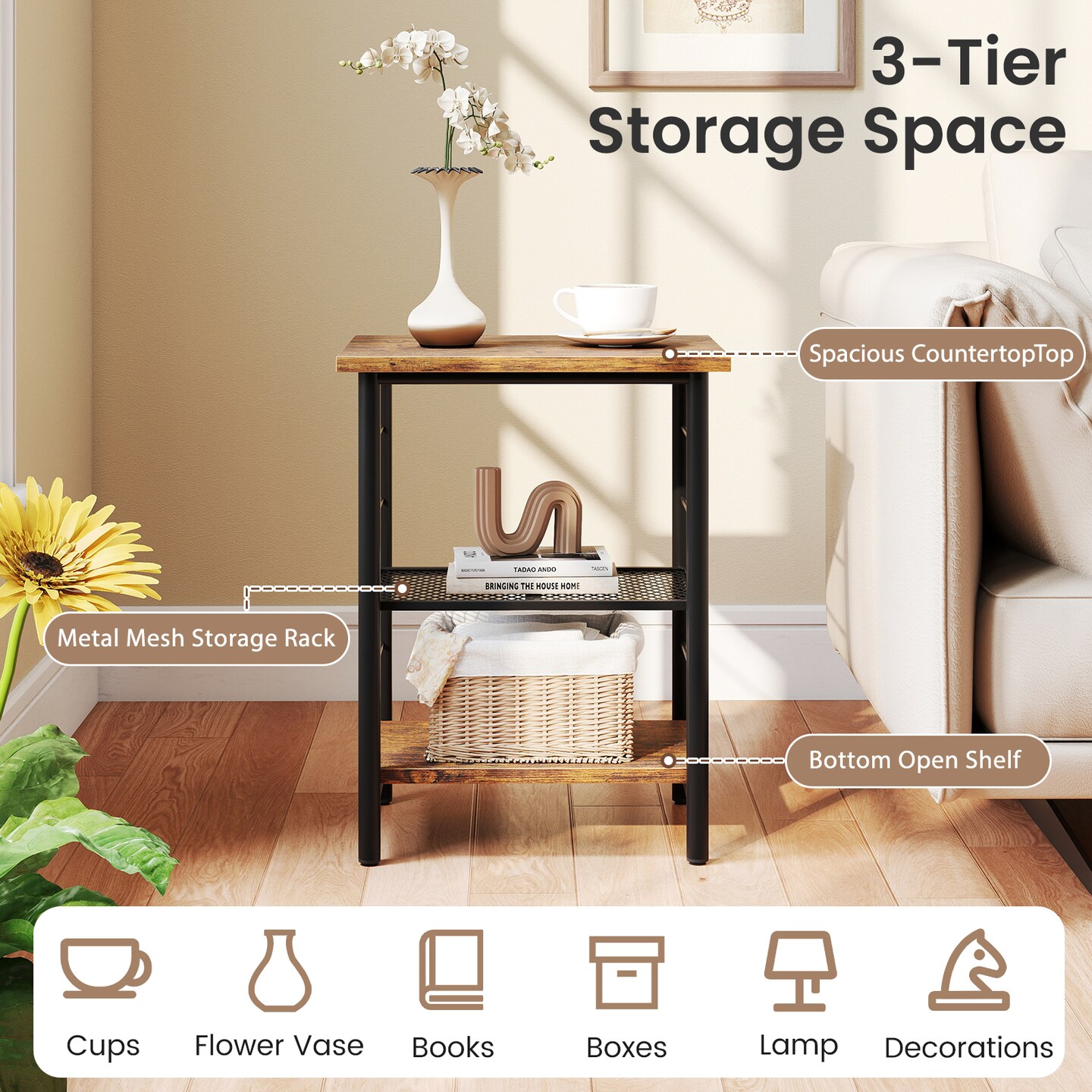 Rustic Brown Engineered Wood Metal 3-Tier Adjustable Shelf Side Table with Storage