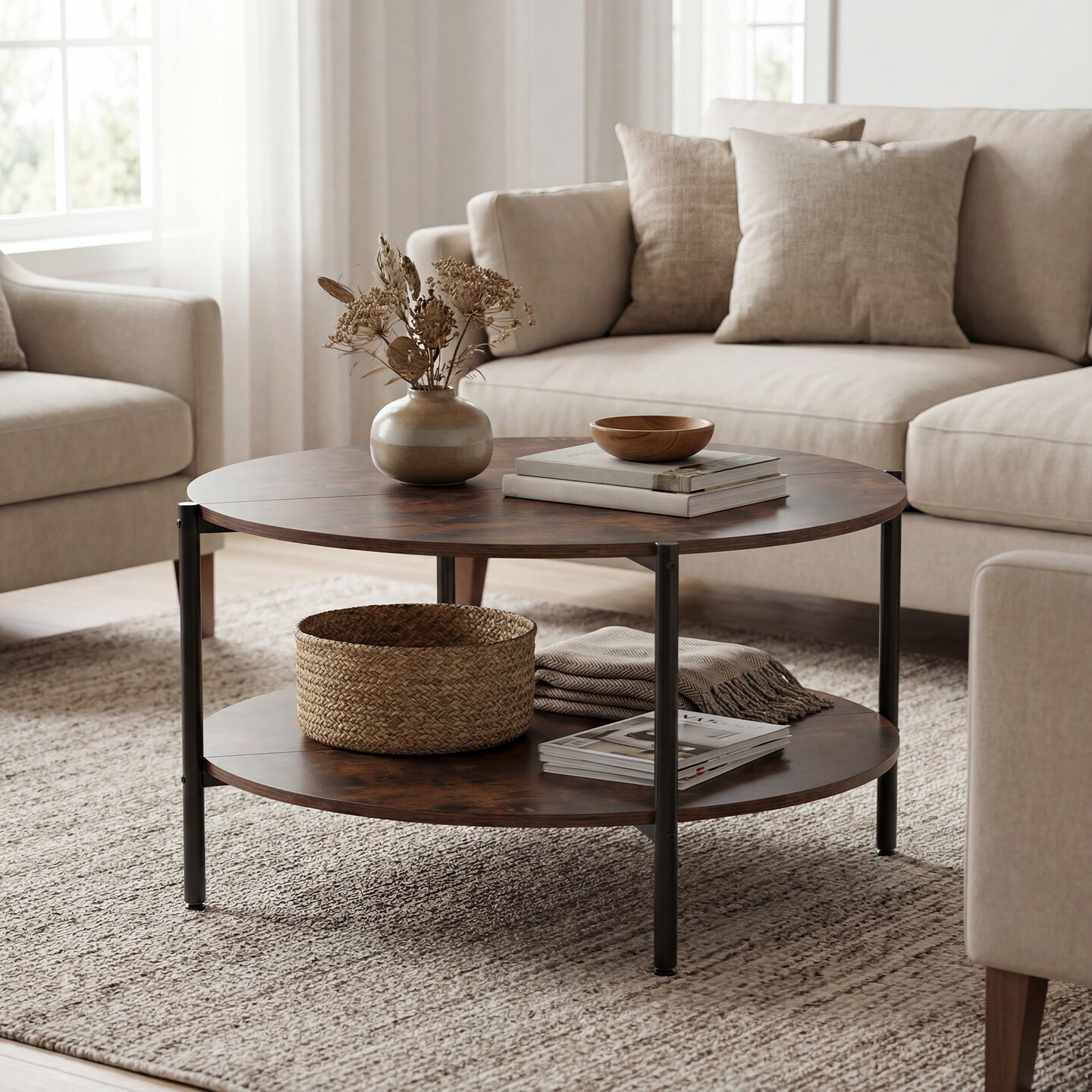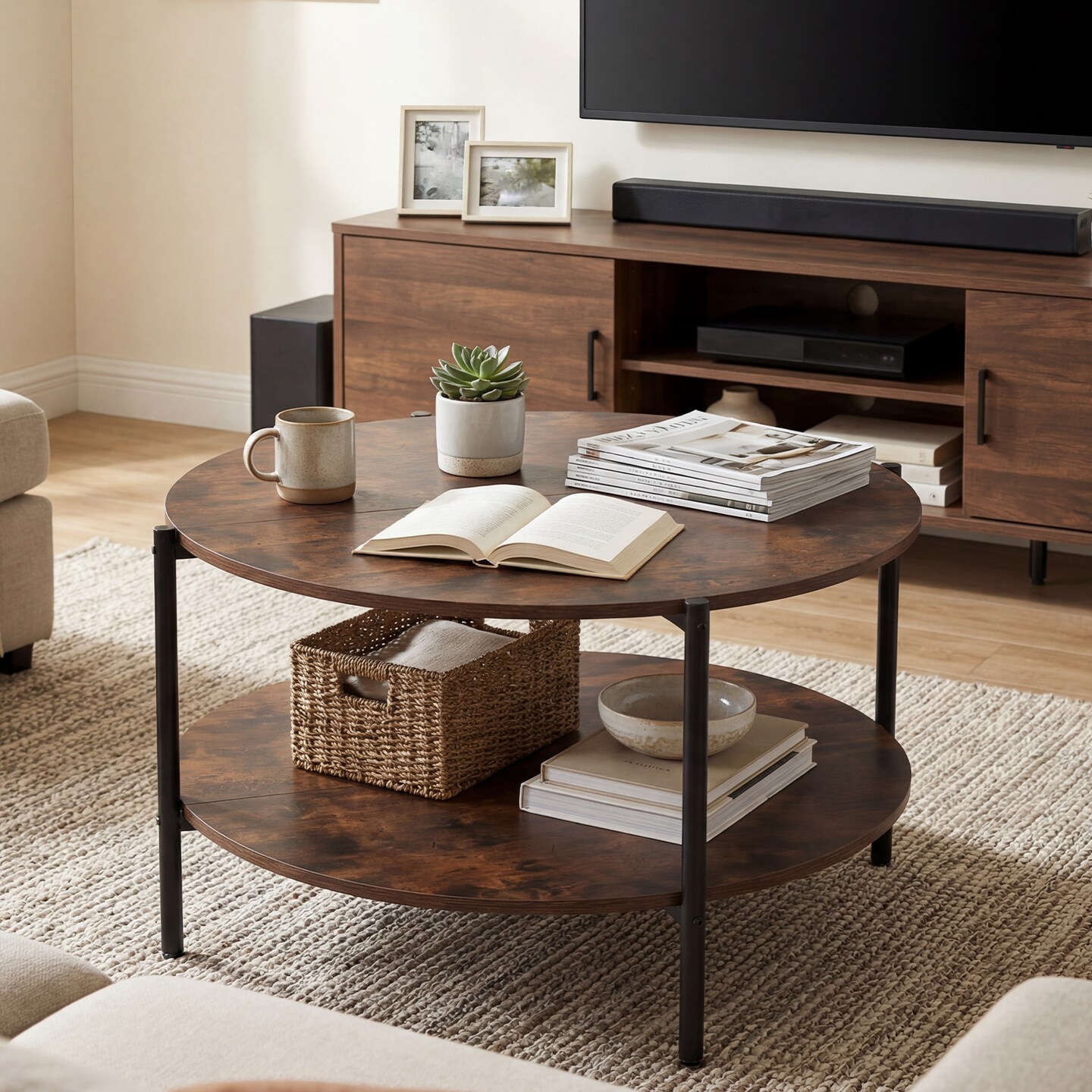 Rustic Brown Industrial Round Coffee Table 2-Tier Storage Accent Table