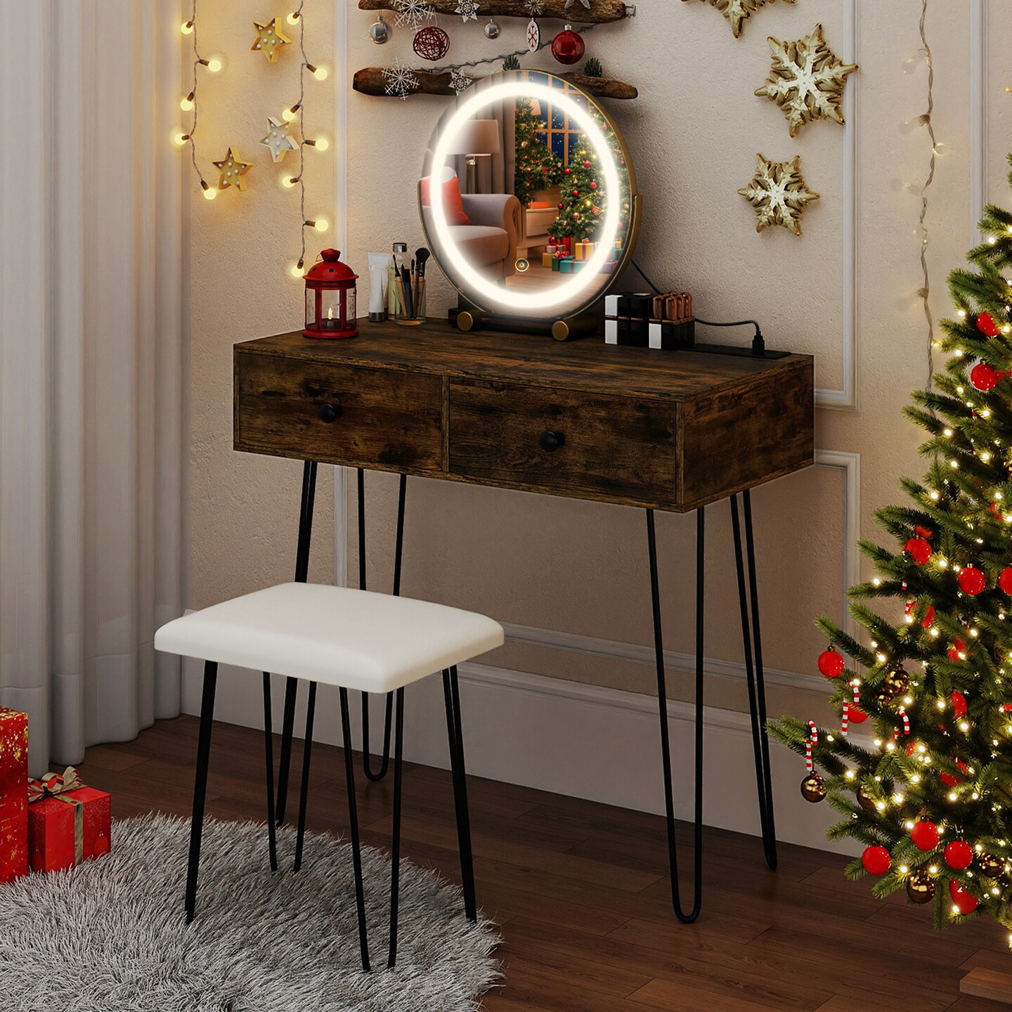 Rustic Brown Vanity Table LED Mirror Touch Control USB Type-C Charging Stool