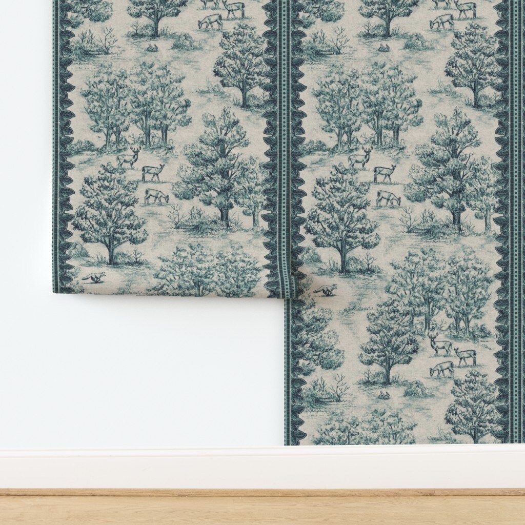 Rustic Cabincore Lodge Deer Fox Forest Stripe Vintage Country Hunting Cabin Cottage Hunting Lodge Teal Toile Farmhouse Trees Woodland Leaves Custom Pre-pasted Wallpaper by Spoonflower Pre-Pasted Wallpaper 2FT Wide