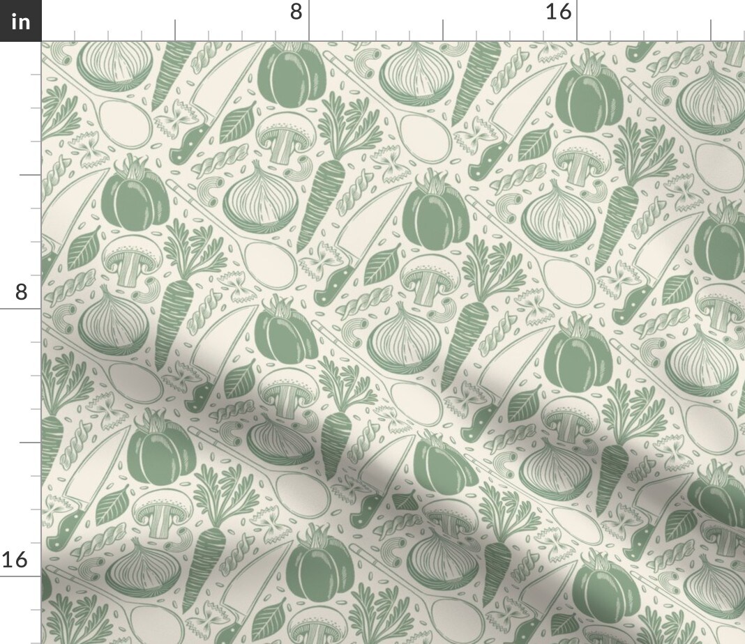 Rustic Cooking Monochrome Green Cream Onion Mushroom Carrot Pepper Pasta Custom Printed Fabric by Spoonflower Various Fabrics by the Yard or Fat Quarter 17539958