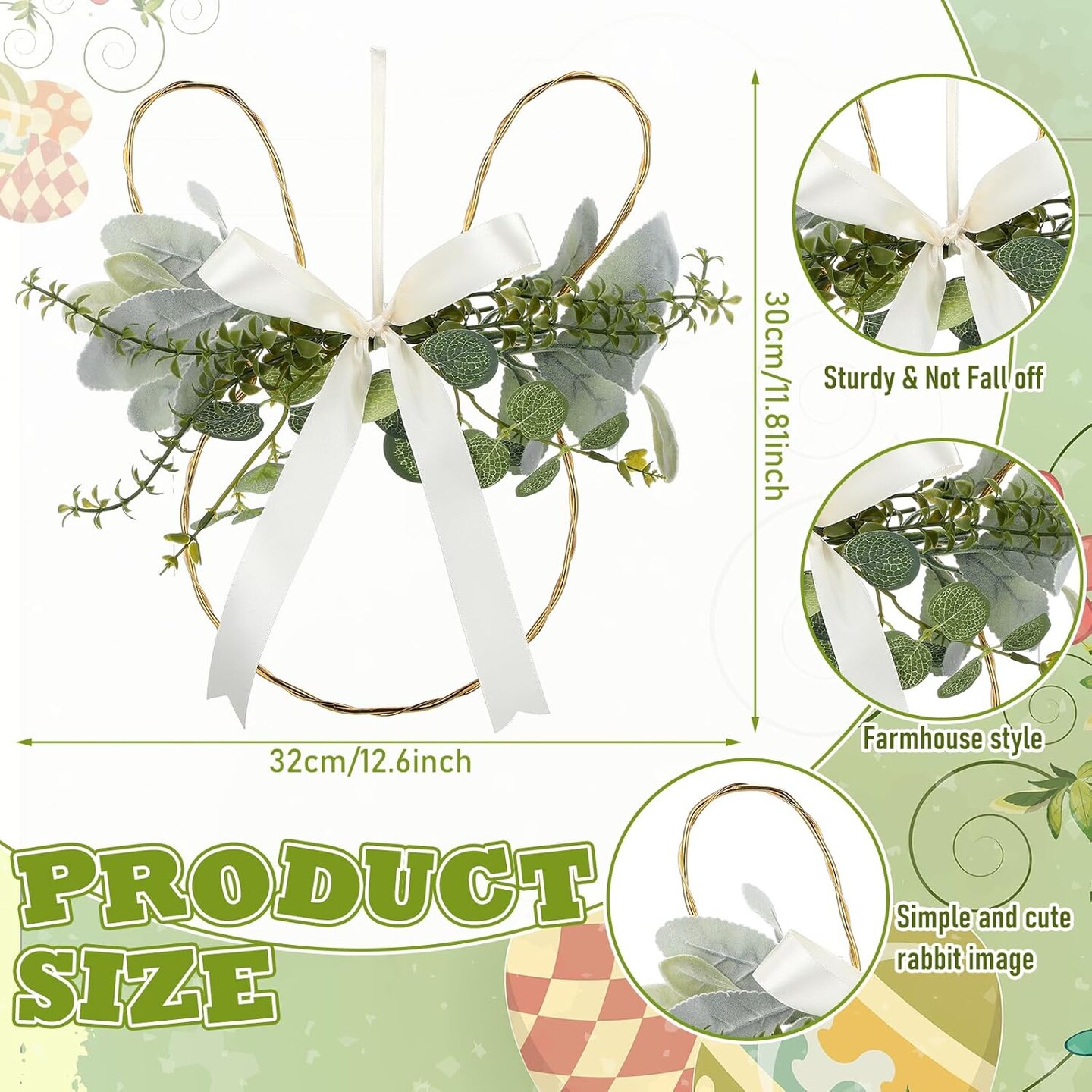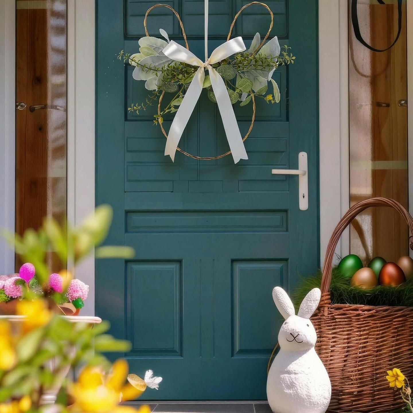Rustic Farmhouse Easter Bunny Wreath – Spring Door & Wall Decor with Lamb’s Ear Greenery and Satin Bow, Indoor & Outdoor