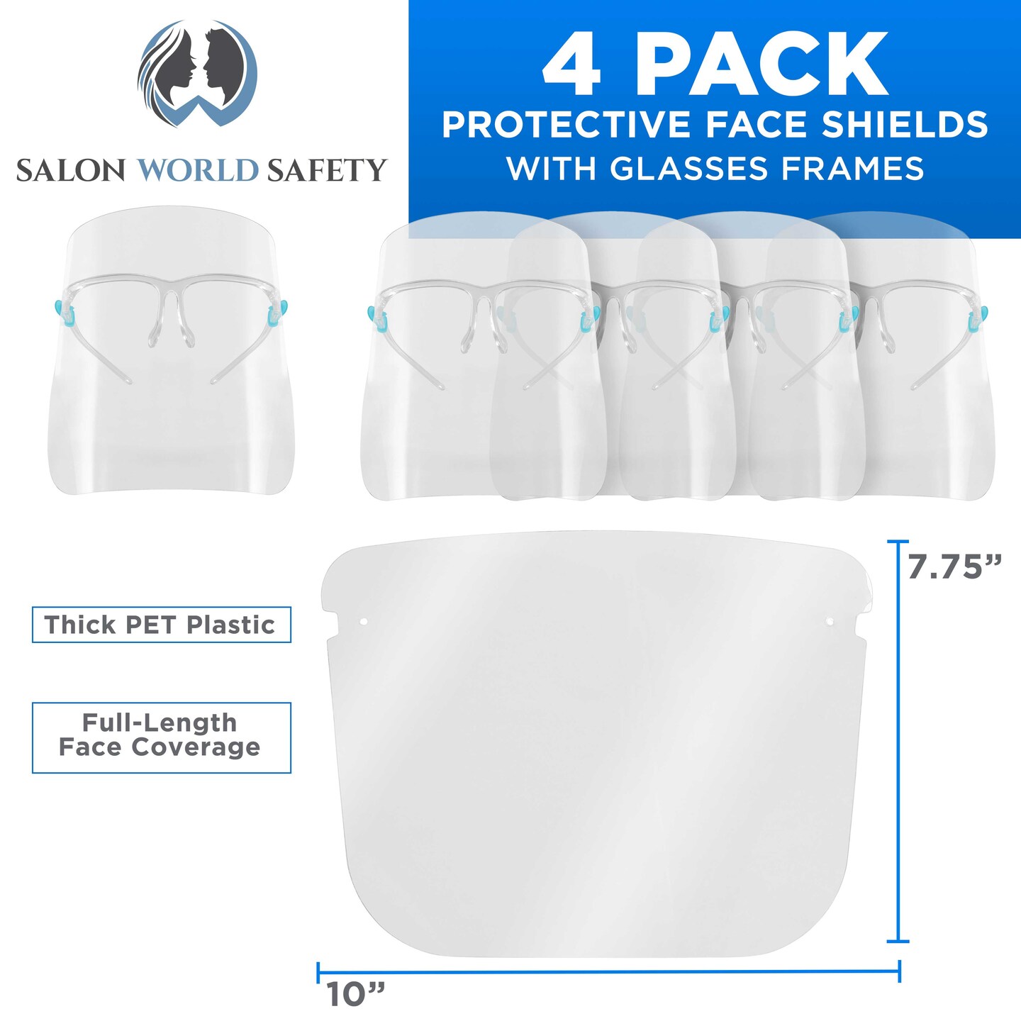 Safety Face Shields with Glasses Frames (Pack of 4) - Ultra Clear Protective Full Face Shields to Protect Eyes, Nose, Mouth - Anti-Fog PET Plastic