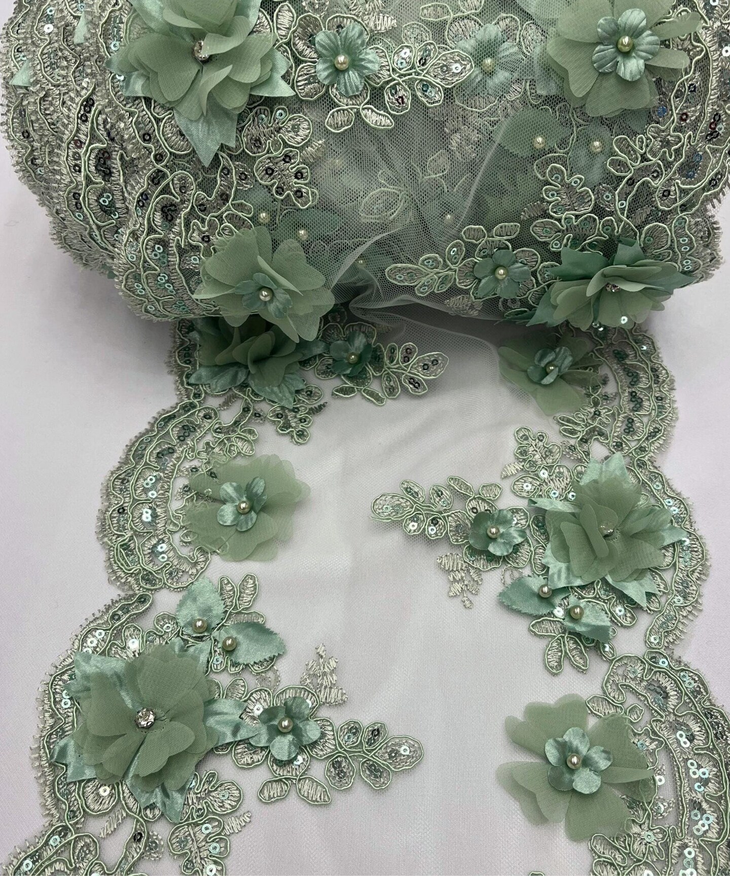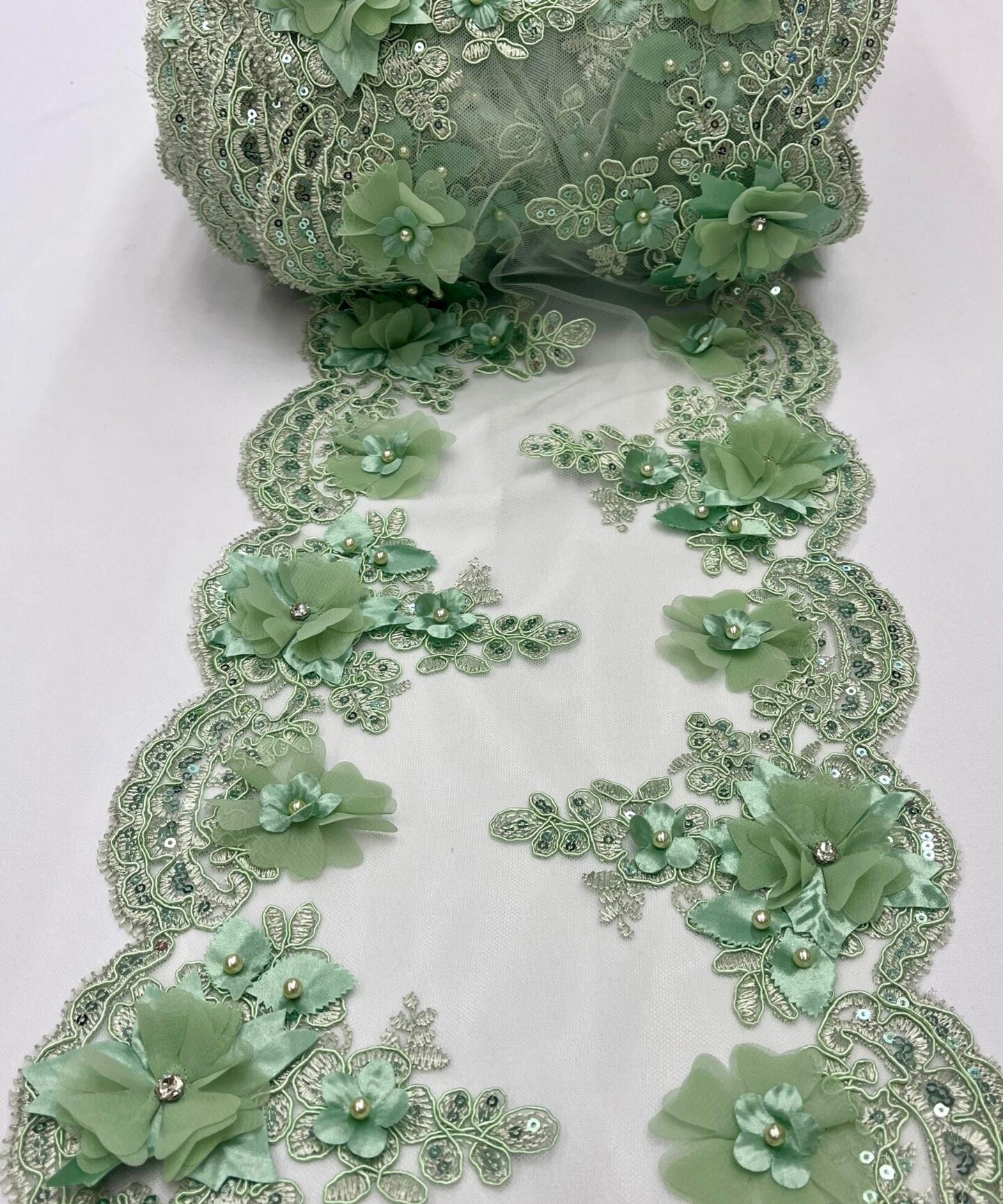 Sage 3D Wide Floral Sequin & Mesh with Pearls Lace Trim for Table Runner 22"