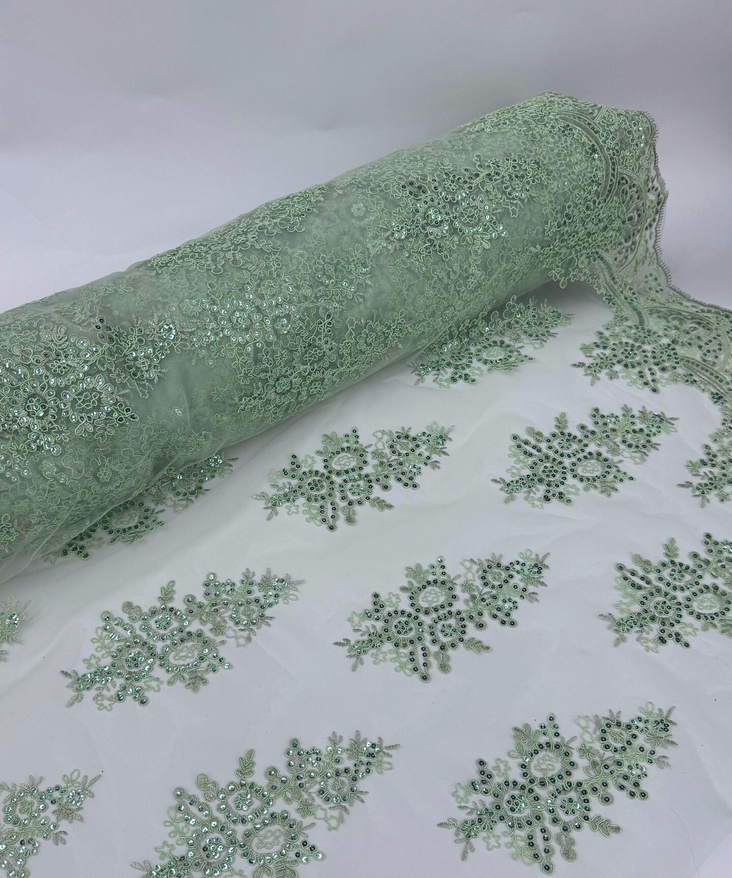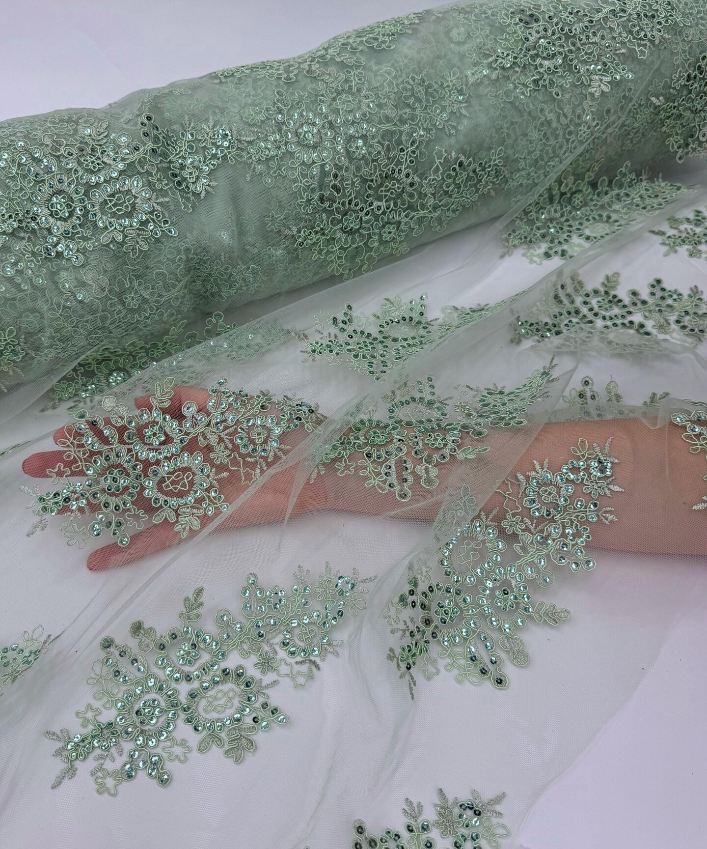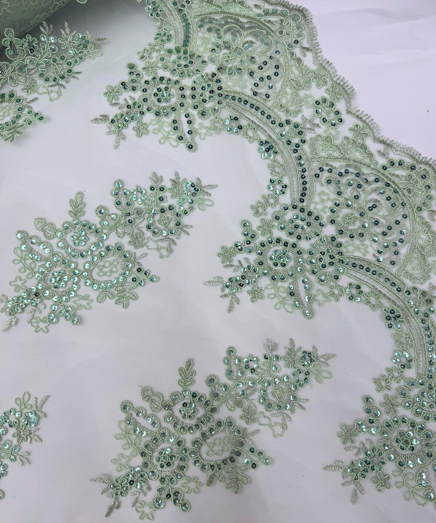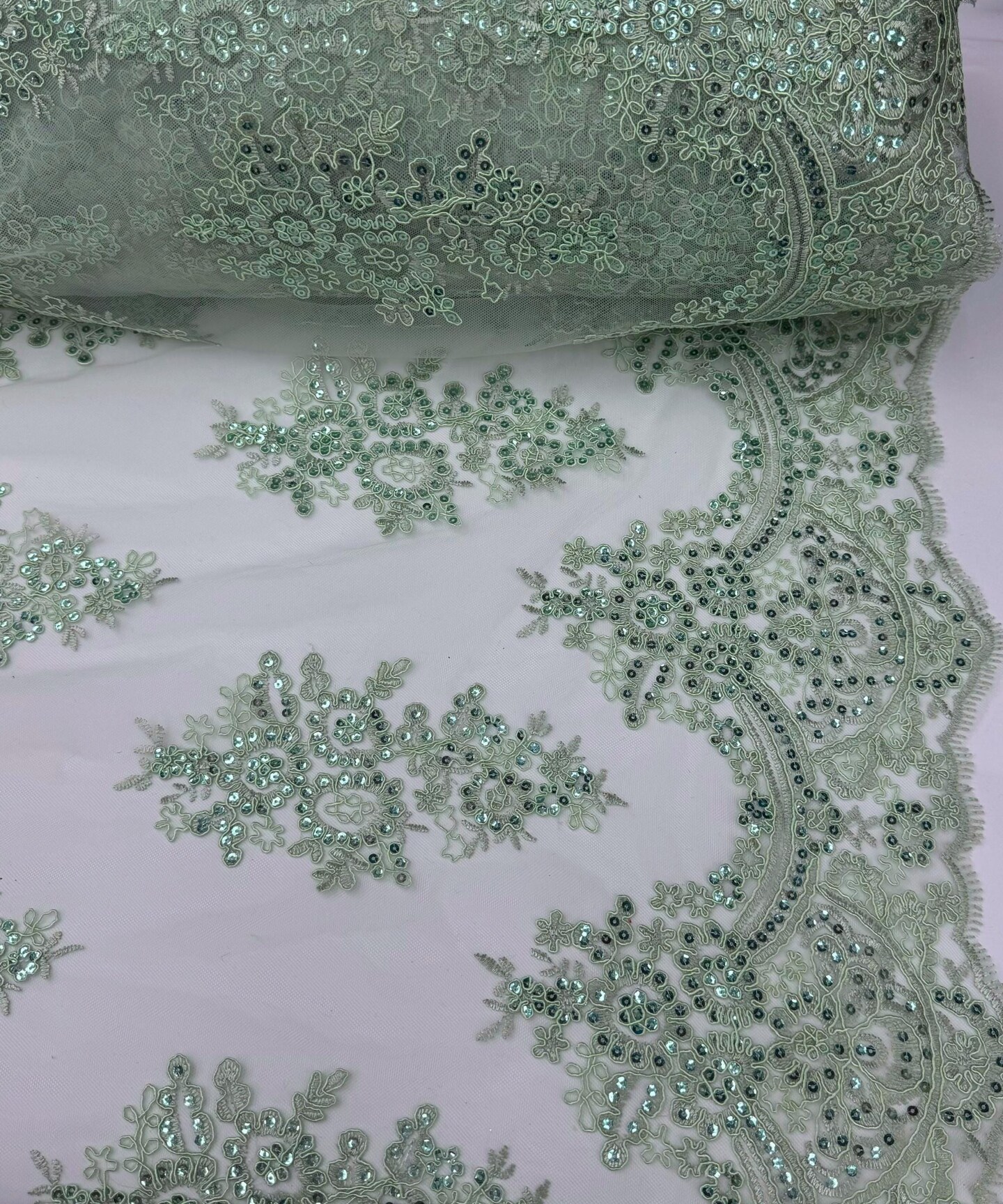 Sage Green Sequin Embroidered Lace Fabric by the Yard, 54" Wide Floral Mesh Lace with Double Scalloped Edges
