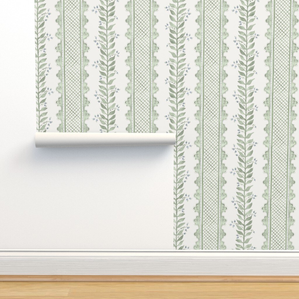 Sage Green Stripe Botanical Watercolor Garden Grandmillenial Custom Removable Wallpaper by Spoonflower Peel & Stick Wallpaper 2FT Wide