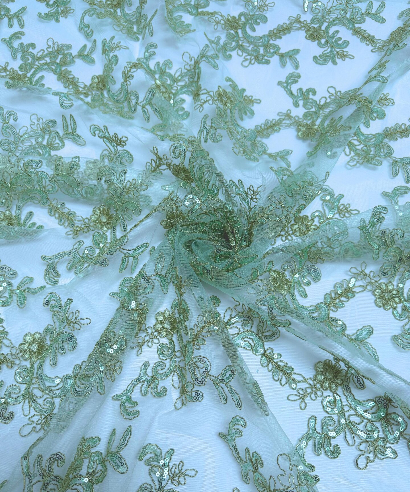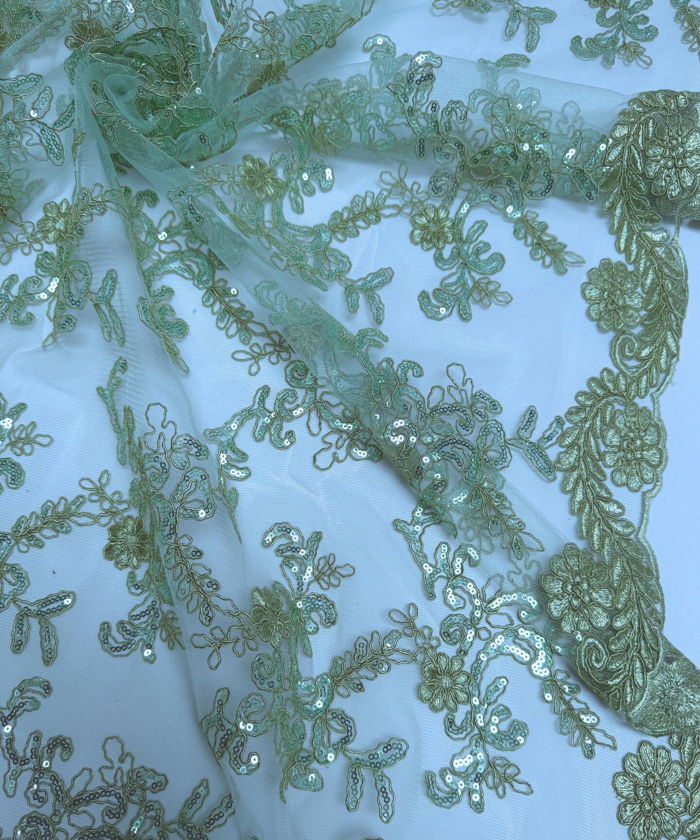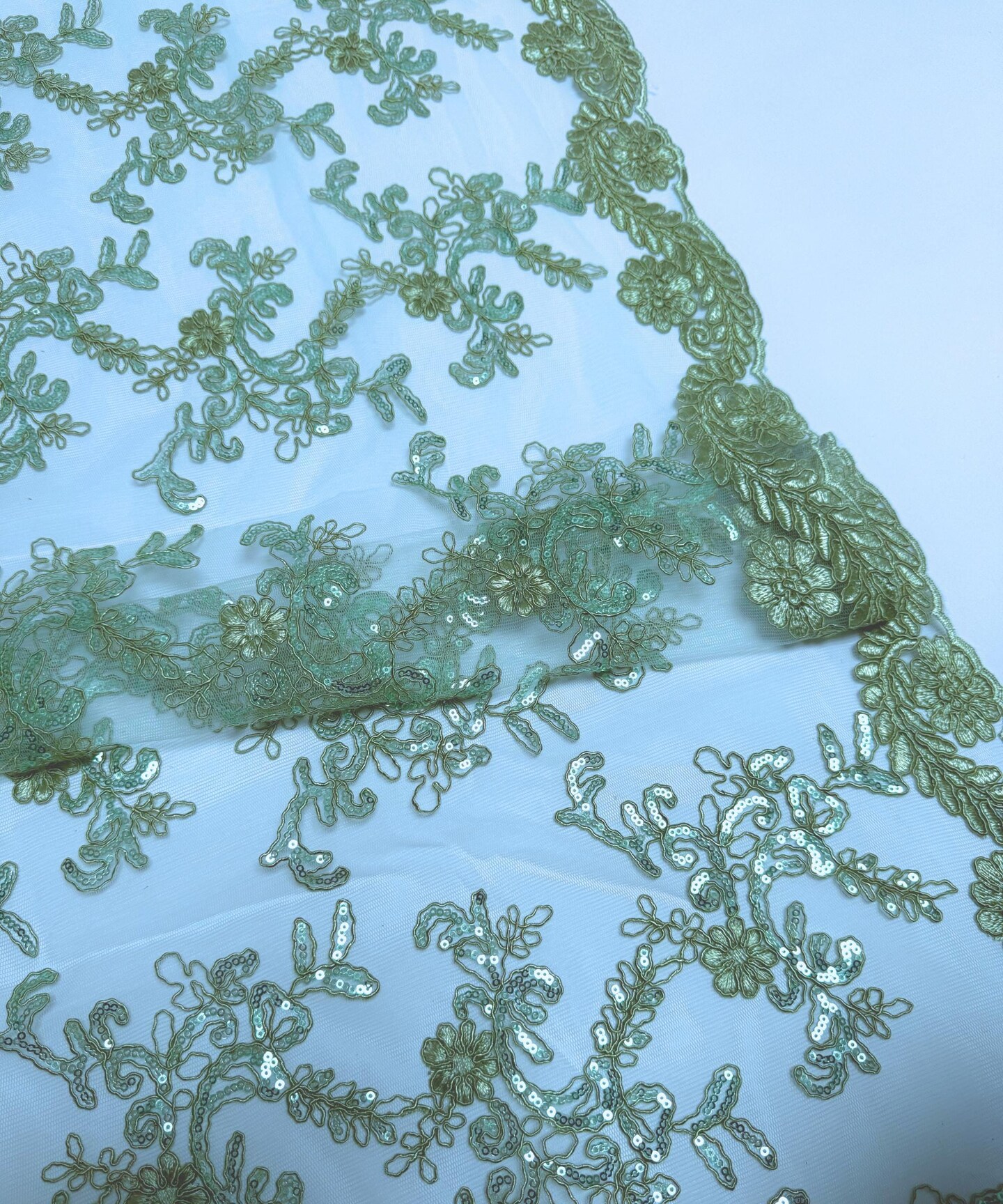 Sage Sequin Embroidered Lace Fabric by the Yard, 54" Wide Floral Mesh Lace with Double Scalloped Edges