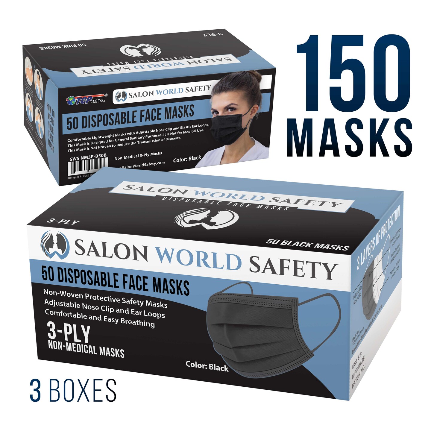 Salon World Safety Black Masks - Bulk 3 Boxes (150 Masks) in Sealed Dispenser Boxes of 50 - 3 Layer Disposable Protective Face Masks, 3-Ply Fabric