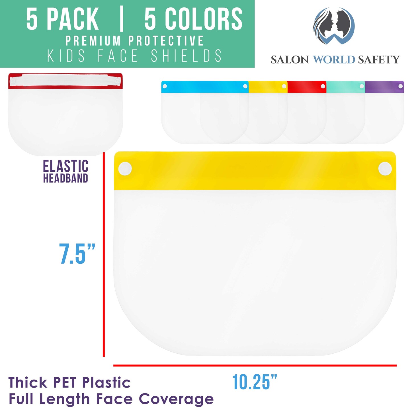Salon World Safety Kids Face Shields (Pack of 5) - 5 Colors, 1 Each - Clear Protective Children's Full Face Shields - Anti-Fog PET Plastic