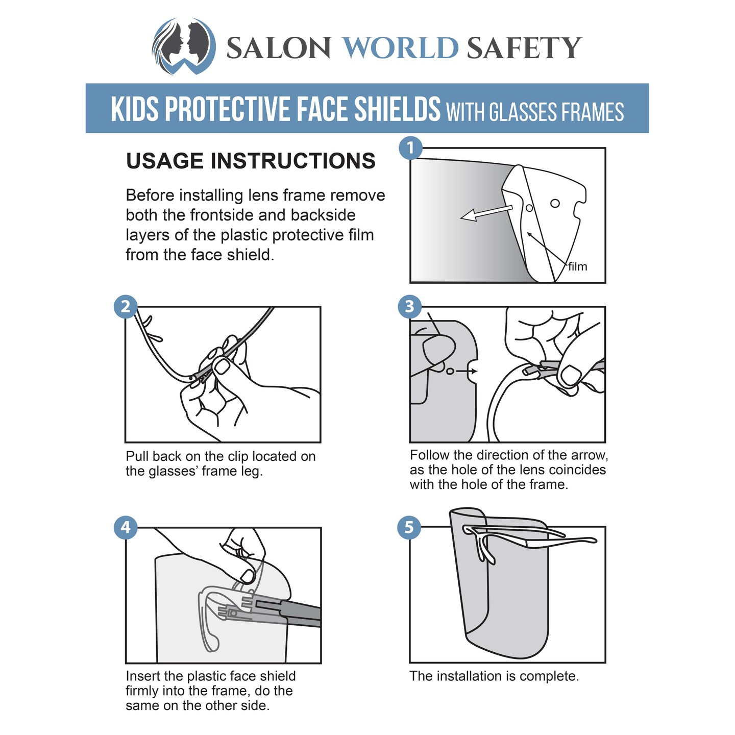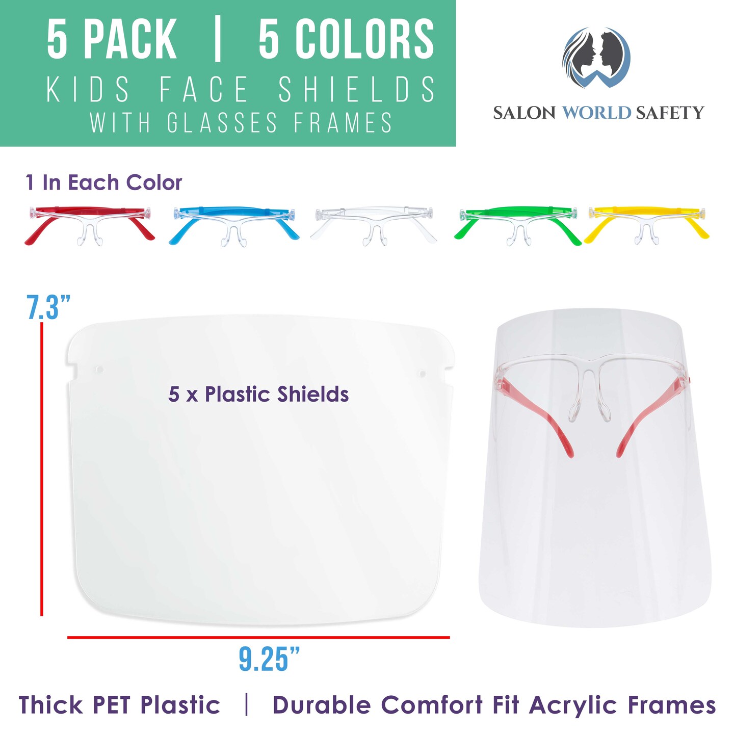 Salon World Safety Kids Face Shields with Glasses Frames (5 Pack) - 5 Colors, 1 Each - Protective Children's Full Face Shields - Anti-Fog PET Plastic