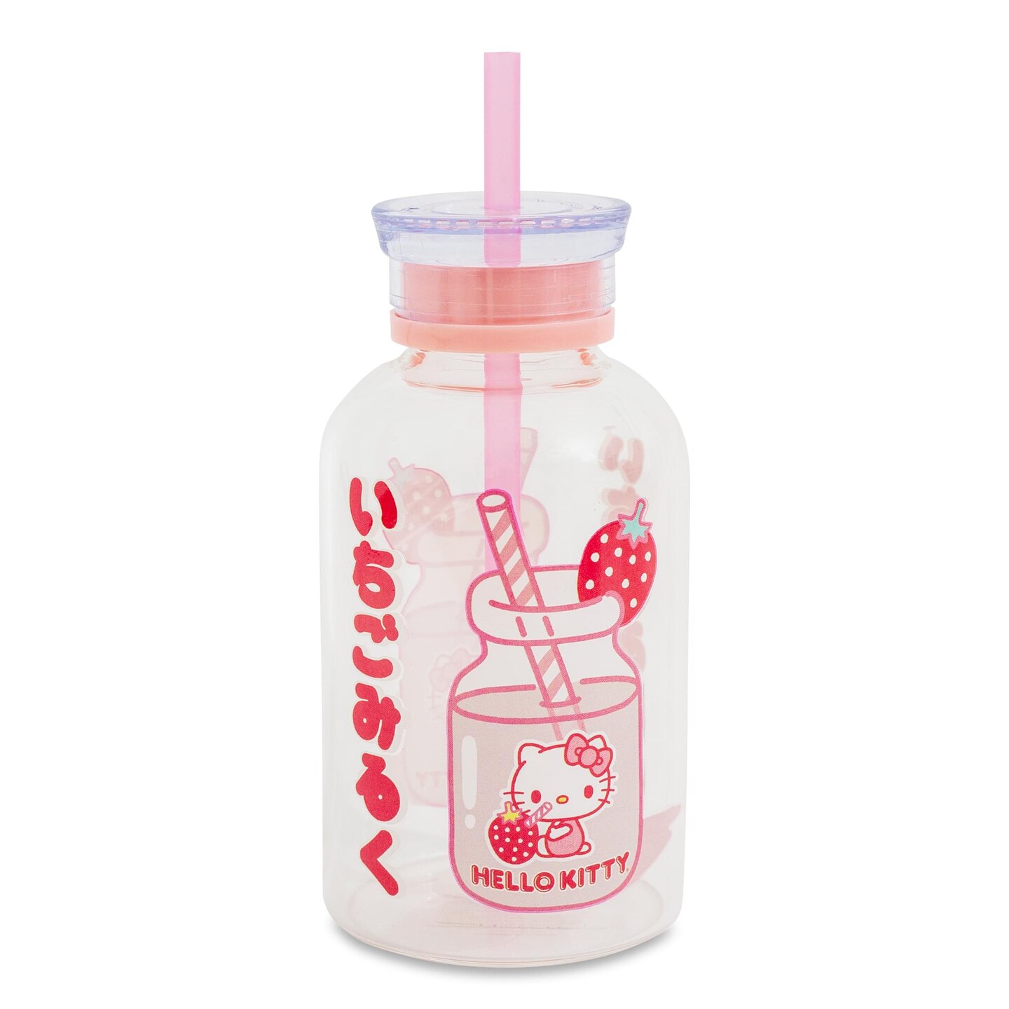 Sanrio Hello Kitty Strawberry Glass Milk Bottle With Straw | Holds 15 Ounces
