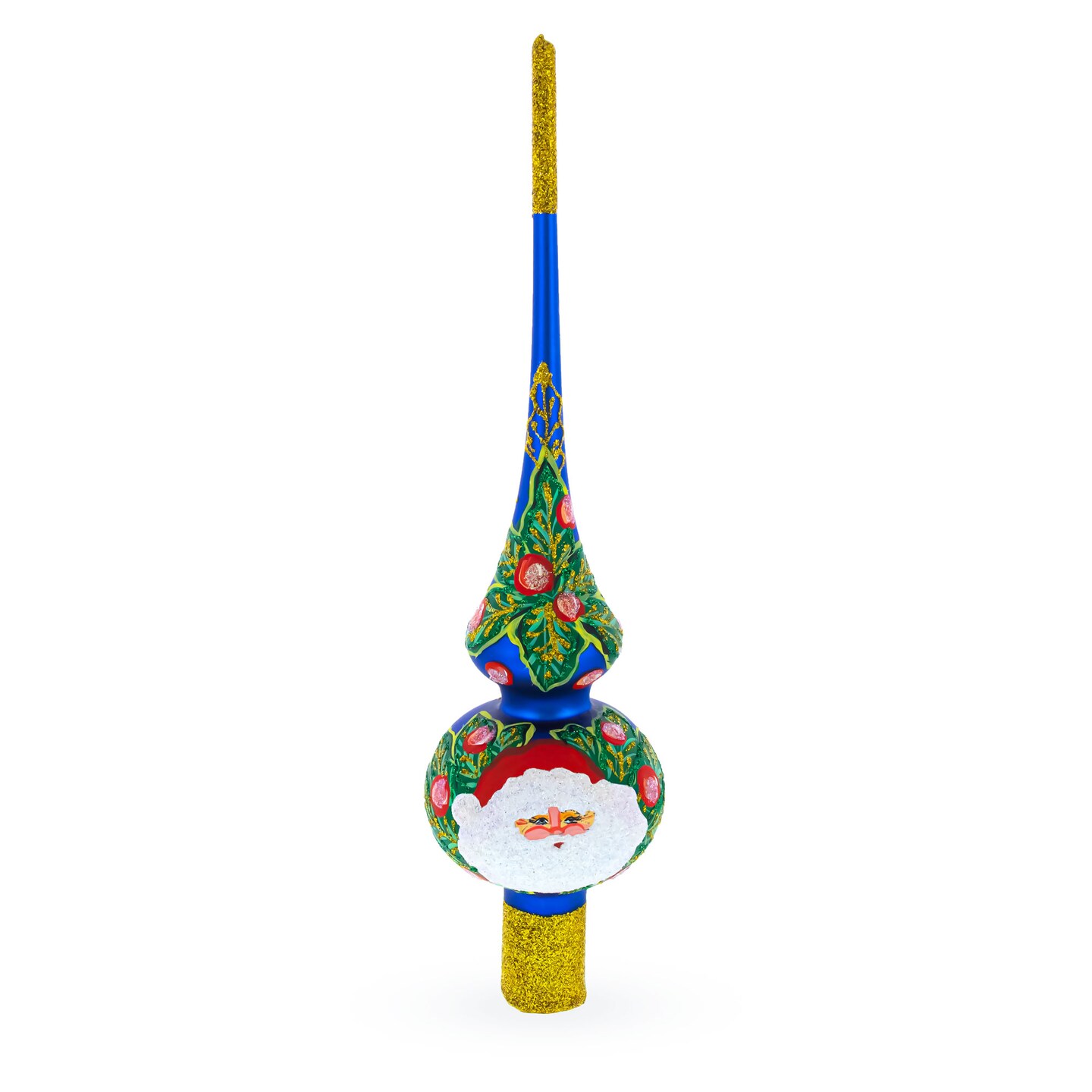 Santa and Mistletoe Wreath on Blue Mouth Blown Glass Christmas Tree Topper 11 Inches