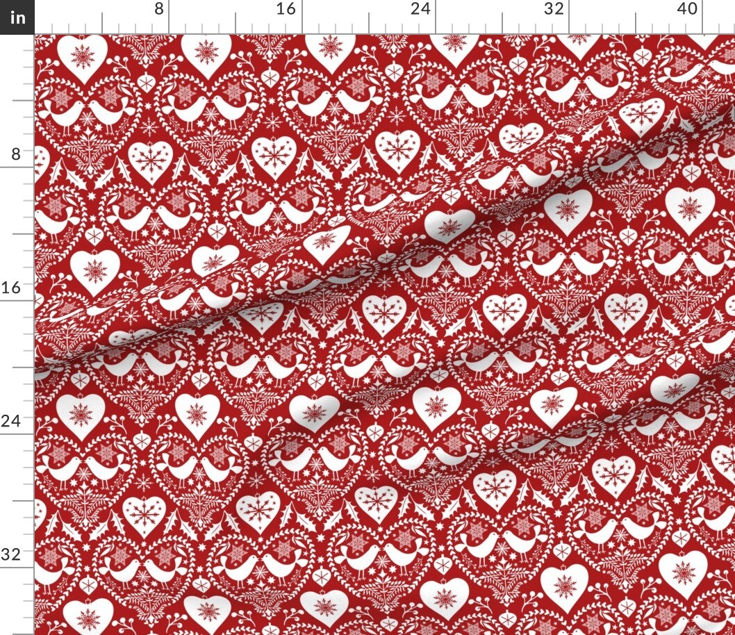 Scandinavian Birds Hearts Holidays Christmas Nordic Folk Art Classic Traditional Red And White Folk Art Christmas Primitive Holly Leaves Stars Custom Printed Fabric by Spoonflower Various Fabrics by the Yard or Fat Quarter