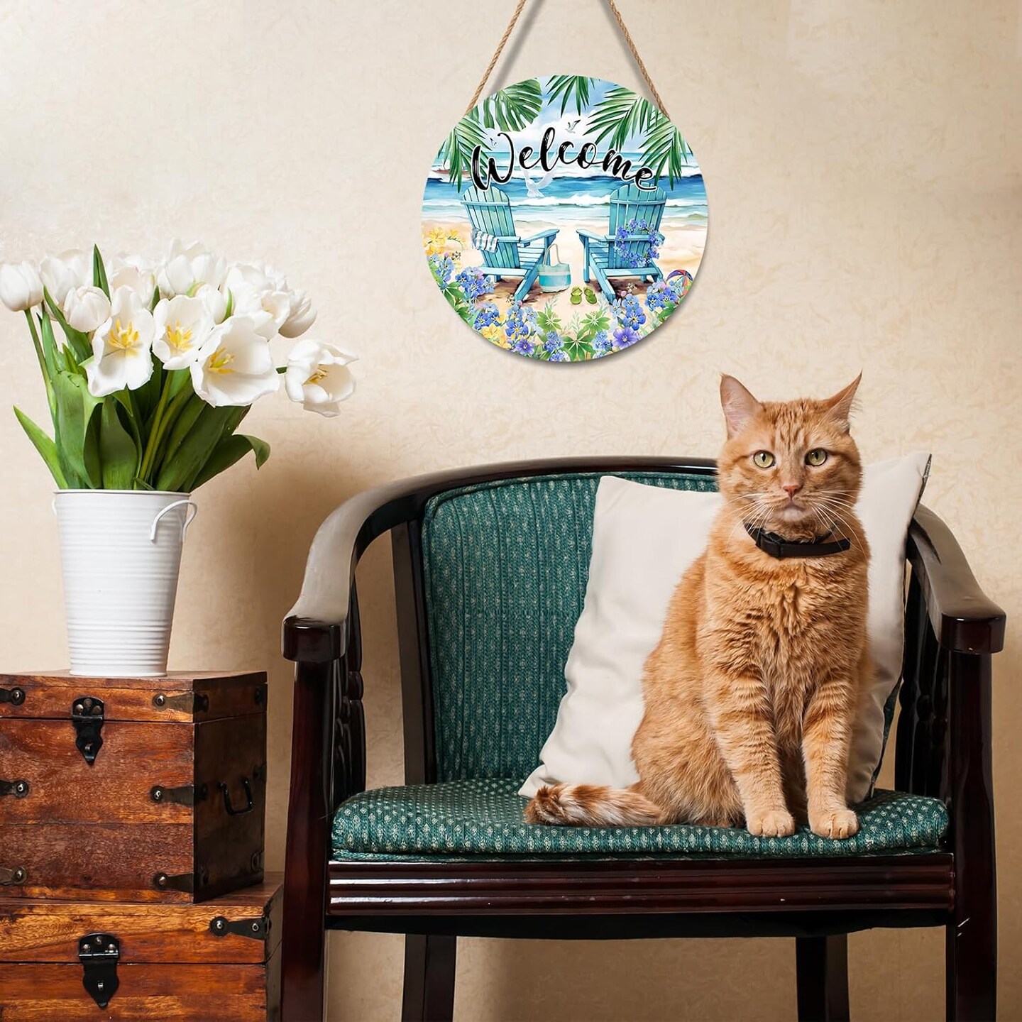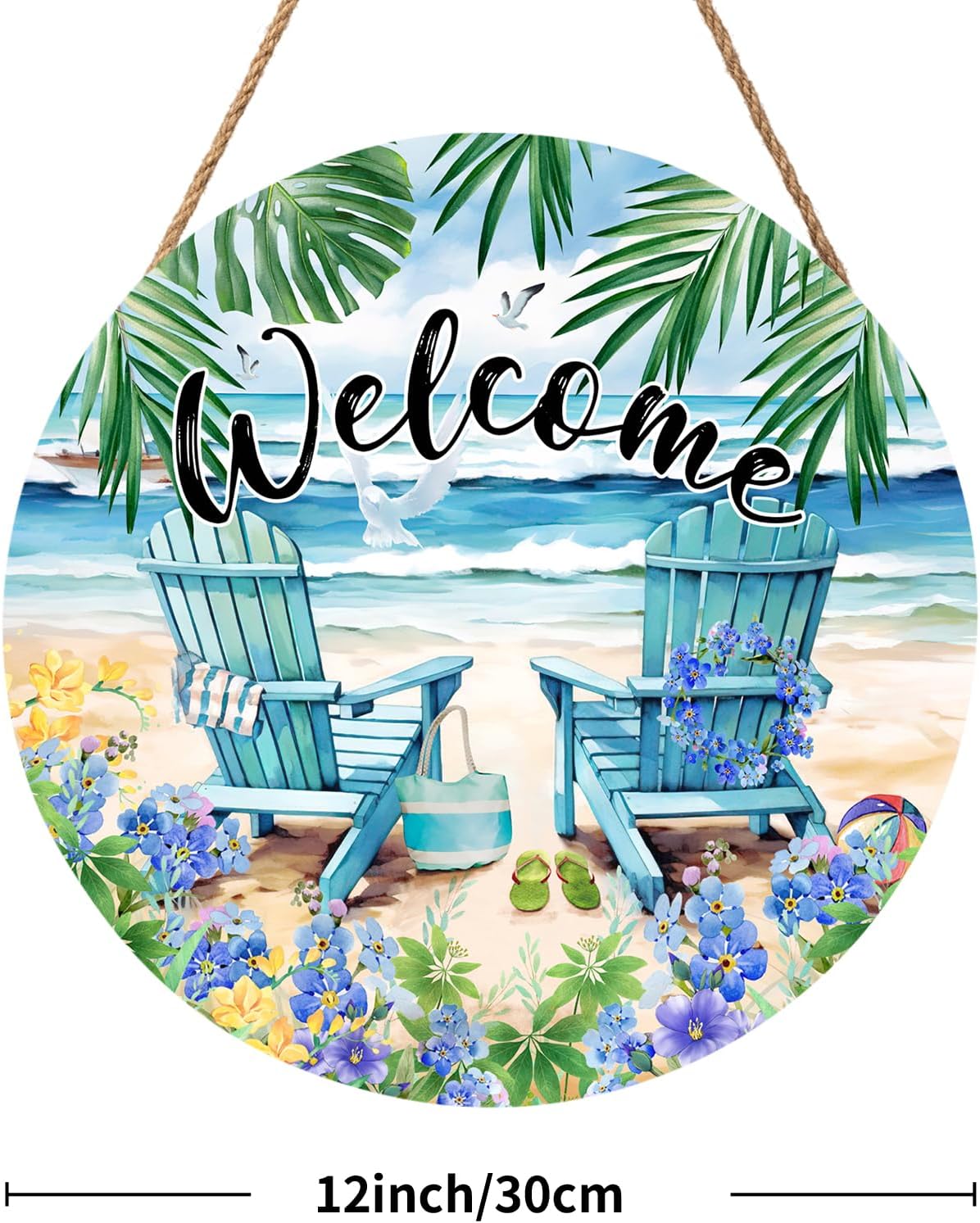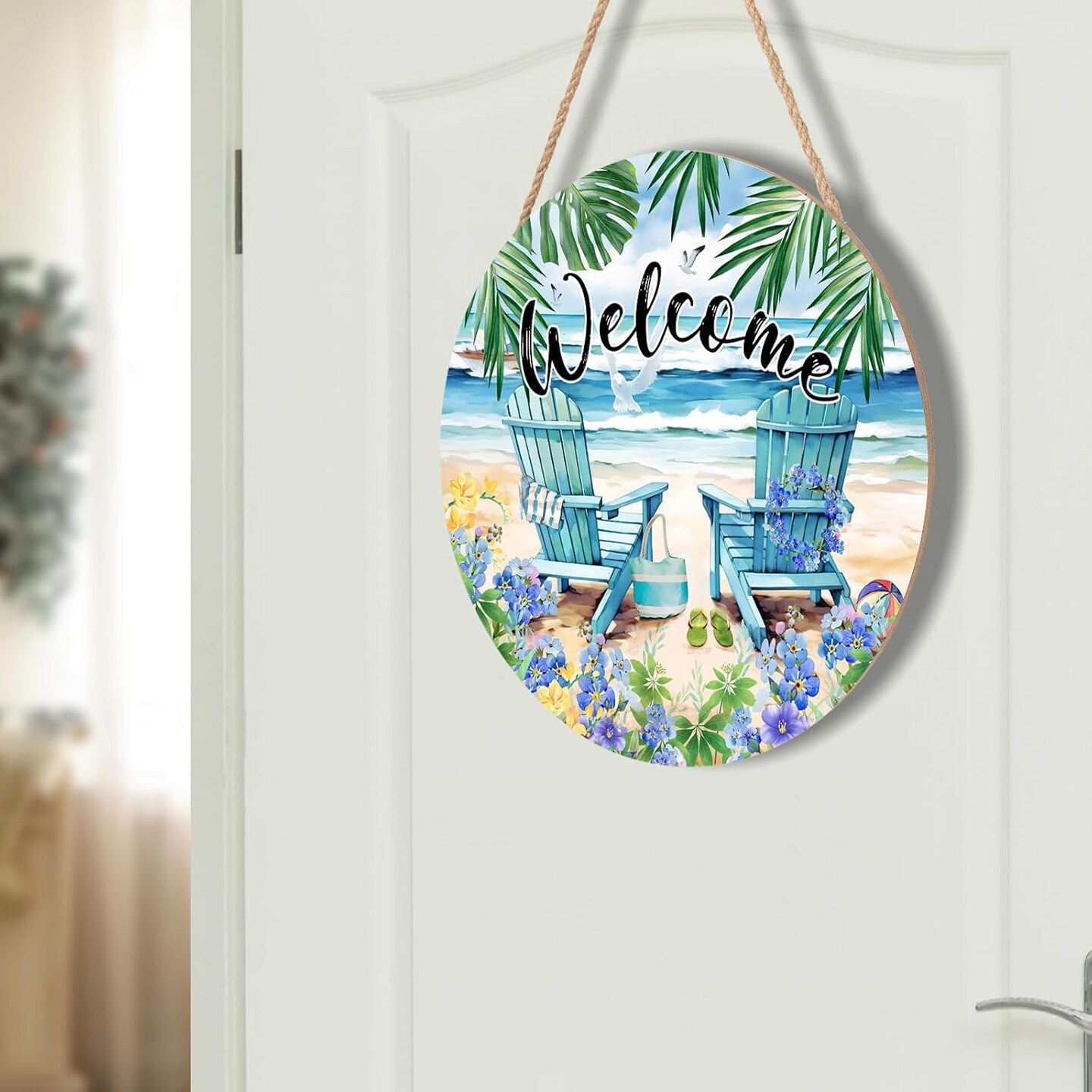 Sea Chair Front Door Sign Flower Wall Hanging Round Door Hanger Farmhouse Coastal Beach Wooden Wreath for Front Door Hello Summer Outdoor Porch Decor 12"X12"
