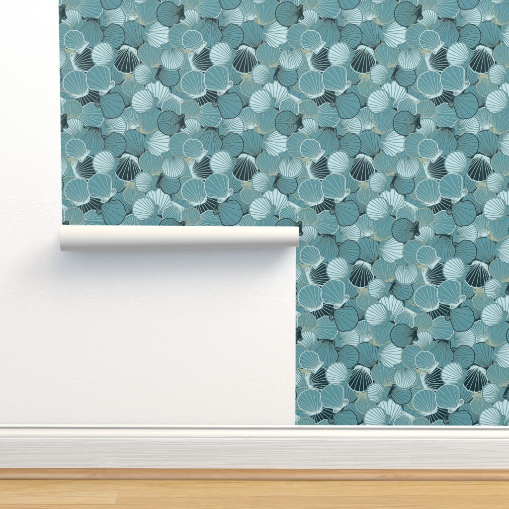 Seashells Ocean Mollusks Beach Coastal Shell Blue Teal Custom Removable Wallpaper by Spoonflower Peel & Stick Wallpaper 2FT Wide