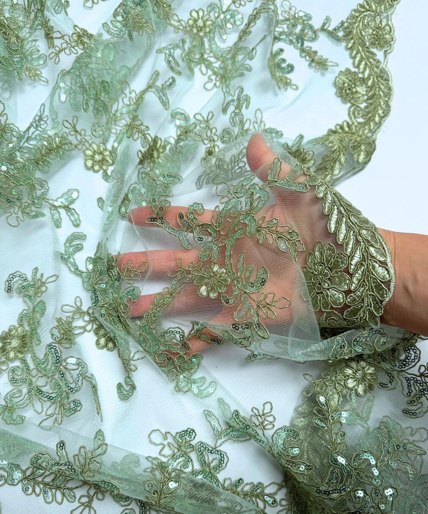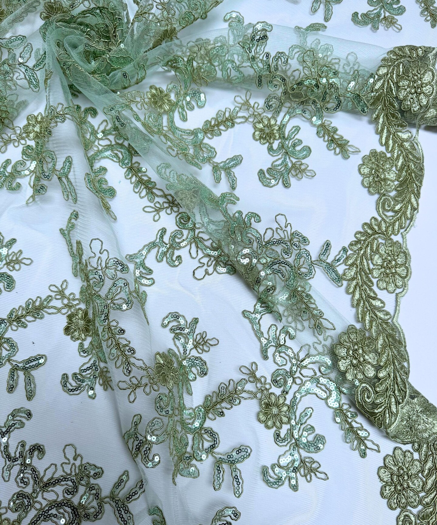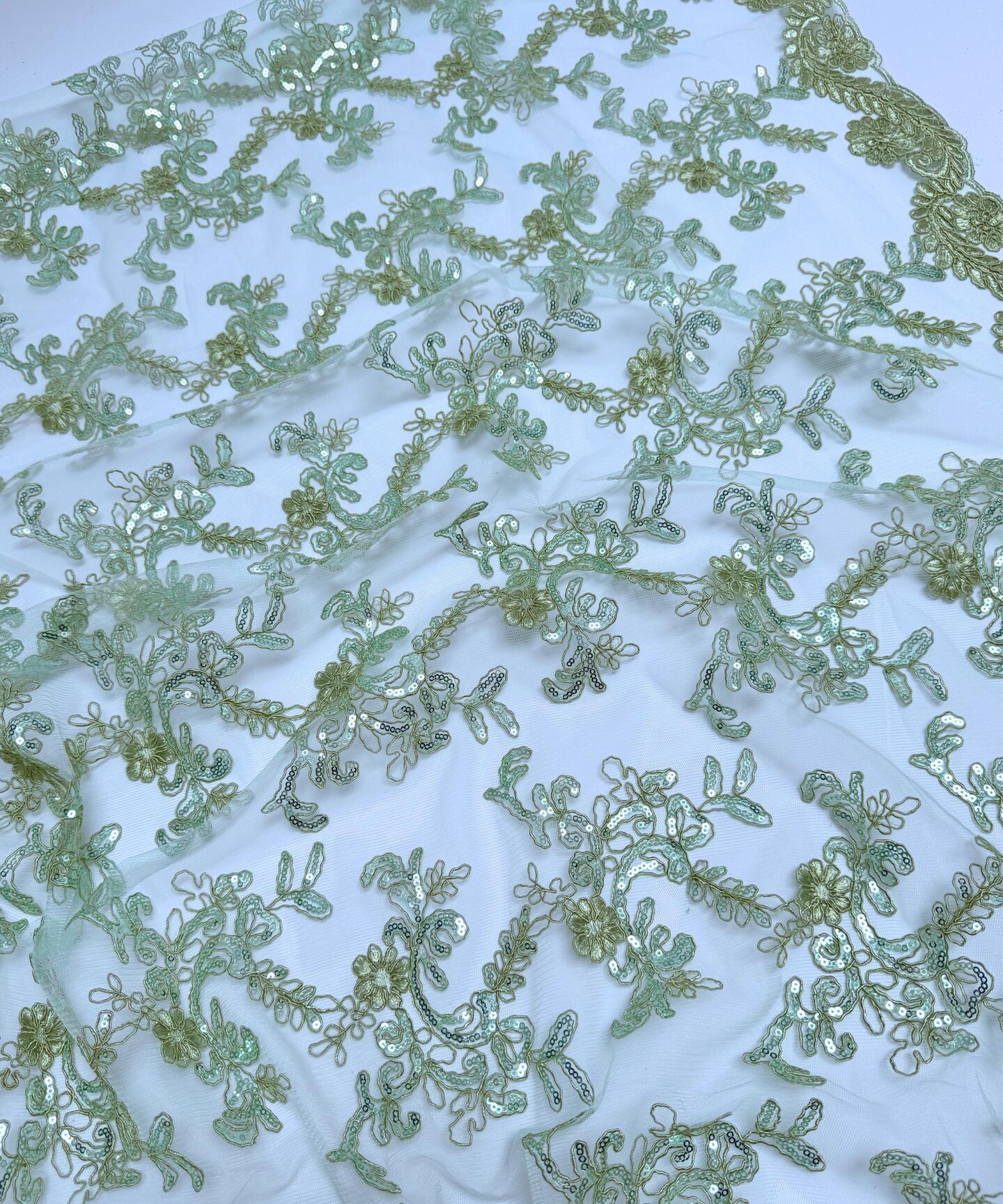 Sequin Embroidered Lace Fabric by the Yard, 54" Wide Floral Mesh Lace with Double Scalloped Edges